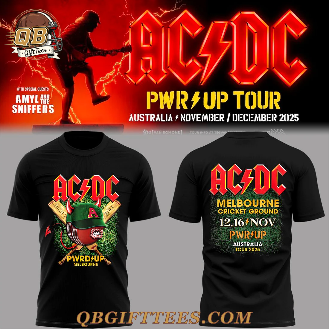 For AC/DC fans who live and breathe the electrifying energy of live rock, the AC/DC Melbourne Edinburgh PWR UP Tour Hoodie captures the undeniable spirit of their anticipated return to Australia. This classic black hooded pullover features a striking front graphic centered around the iconic red and orange AC/DC lightning bolt logo. Below, a stylized green cricket helmet rests atop a fierce red cricket ball, flanked by two crossed cricket bats, all underscored by “PWRD UP MELBOURNE” in a vibrant green and white. The back of the hoodie showcases the unmistakable AC/DC logo in matching red and orange, above the specific tour details: “MELBOURNE CRICKET GROUND 12, 16 NOV PWR UP AUSTRALIA TOUR 2025” rendered in green and white, set against a subtle, textured green pattern. Crafted from a comfortable 80% cotton / 20% polyester fleece blend, this AC/DC Melbourne Edinburgh PWR UP Tour Hoodie offers a standard mid-weight feel, approximately 280-300 GSM, ensuring both warmth and a soft interior. It features a classic pullover design with an adjustable drawstring hood and a spacious front kangaroo pocket, available in a range of standard adult sizes.