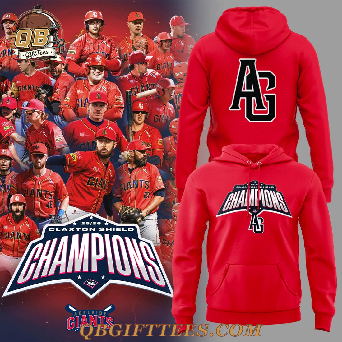 Show your unwavering faith in the Adelaide Giants with the Adelaide Giants We are your 2025/26 ABL Champions Hoodie. This commemorative garment allows fans to boldly display their pride and anticipation for a landmark achievement in Australian baseball. The hoodie is presented in a vibrant team-red, featuring a bold graphic on the front: “25/26 Claxton Shield Champions” with the iconic Adelaide Giants “AG” script logo positioned beneath. The “CHAMPIONS” text is rendered in striking white with a strong black outline, complemented by blue “Claxton Shield” lettering and white “25/26” details, all centered above a distinct black and white “AG” logo. The reverse of the hoodie showcases a large, impactful black “AG” script logo, outlined in white, ensuring your team loyalty is visible from any angle. Constructed from a soft, medium-weight 280 GSM cotton-polyester fleece blend, this hoodie offers both comfort and durability.