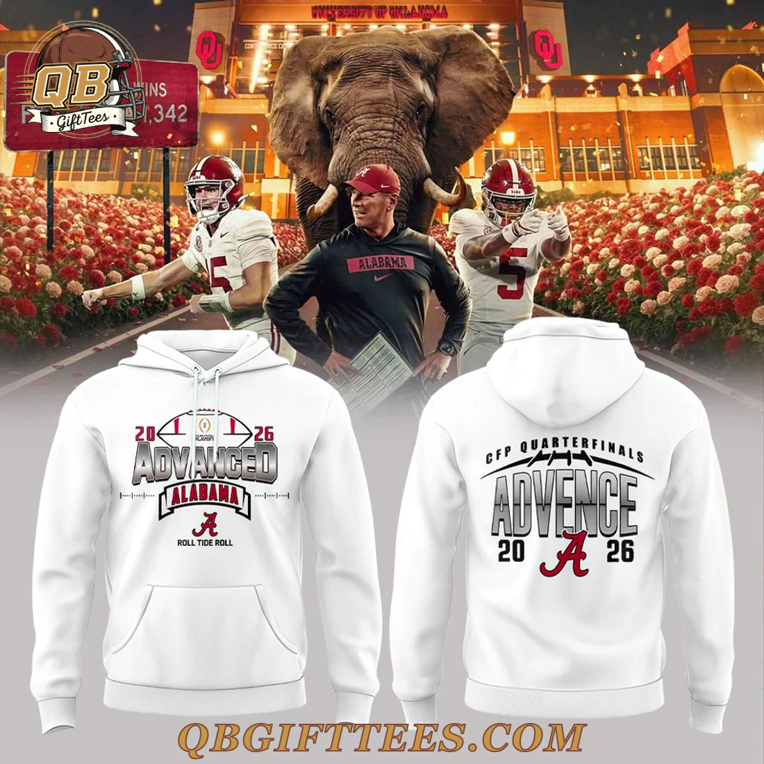 The Alabama Crimson Tide WAY BACK TO ADVANCE Edition White Hoodie celebrates the enduring spirit of Crimson Tide football, uniting fans across every generation. This classic white pullover hoodie features a dynamic front graphic centered around the word “ADVANCED,” designed with a layered effect, flanked by “20” and “26.” Above this, a stylized football emblem incorporates “PLAYOFF” and “CFP,” while “ALABAMA” in a traditional script, followed by the iconic ‘A’ emblem and “ROLL TIDE ROLL,” completes the design. The back of the hoodie carries the message “CFP QUARTERFINALS” above a bold “ADVANCE” text, mirroring the “20” and “26” and the ‘A’ emblem found on the front. This comfortable garment is constructed from a durable 50% cotton / 50% polyester blend, offering a medium-heavy fabric weight of approximately 8.0 oz/yd² (271 g/m²), ensuring warmth and longevity. It features a classic drawstring hood and a practical front kangaroo pocket, with designs applied via high-quality screen printing for lasting visual clarity.