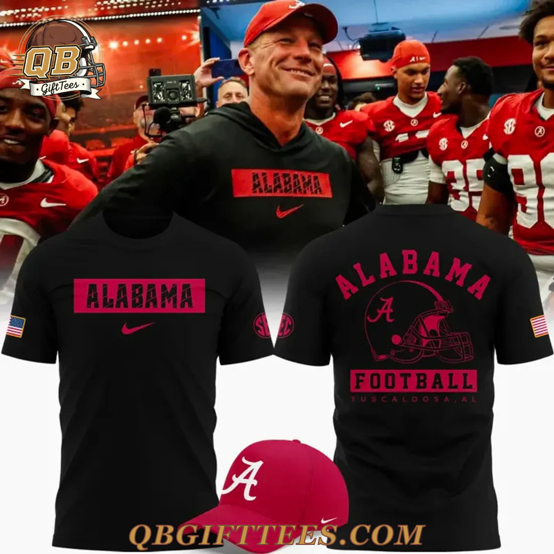 The Alabama Football 2025 Black Hoodie connects fans to the enduring legacy and passion of Crimson Tide football. This hoodie features a striking design on a deep black fabric. The front prominently displays “ALABAMA” in bold red block lettering, underlined by a classic red swoosh logo, positioned centrally on the chest. The left sleeve features an embroidered SEC logo, while the right sleeve proudly bears a woven US flag patch. On the reverse, “ALABAMA” is arched above a detailed graphic of a football helmet with the iconic script ‘A’ logo, all rendered in crimson red. Below the helmet, “FOOTBALL” and “TUSCALOOSA, AL” are presented, completing the design. Crafted from what appears to be a comfortable, mid-weight cotton-polyester blend, this garment is designed for durability* and a soft feel. Precise fabric weight and dimensional specifics are not discernible from the imagery but it is constructed for a standard, relaxed fit.