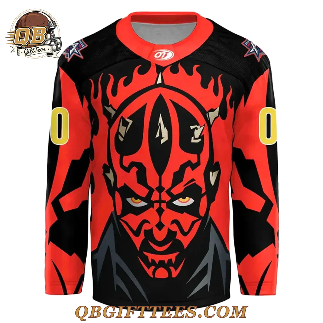 For fans who bridge the gap between ice hockey and a galaxy far, far away, the Allen Americans Star Wars Night 2025 Hockey Jersey celebrates a unique crossover event. This fan collectible captures the menacing presence of Darth Maul, rendered vibrantly across the front with his iconic red and black facial tattoos. Flames and stylized patterns in matching red and black emanate from the central graphic, spreading across the chest and sleeves. The shoulders feature black mesh panels with the subtle Allen Americans star logo, while bold yellow ‘0’ digits adorn both sleeve cuffs. Crafted from durable, moisture-wicking performance polyester fabric (approximately 200 GSM), this jersey provides a comfortable yet robust feel, enhanced by precision sublimated graphics that ensure lasting color vibrancy.