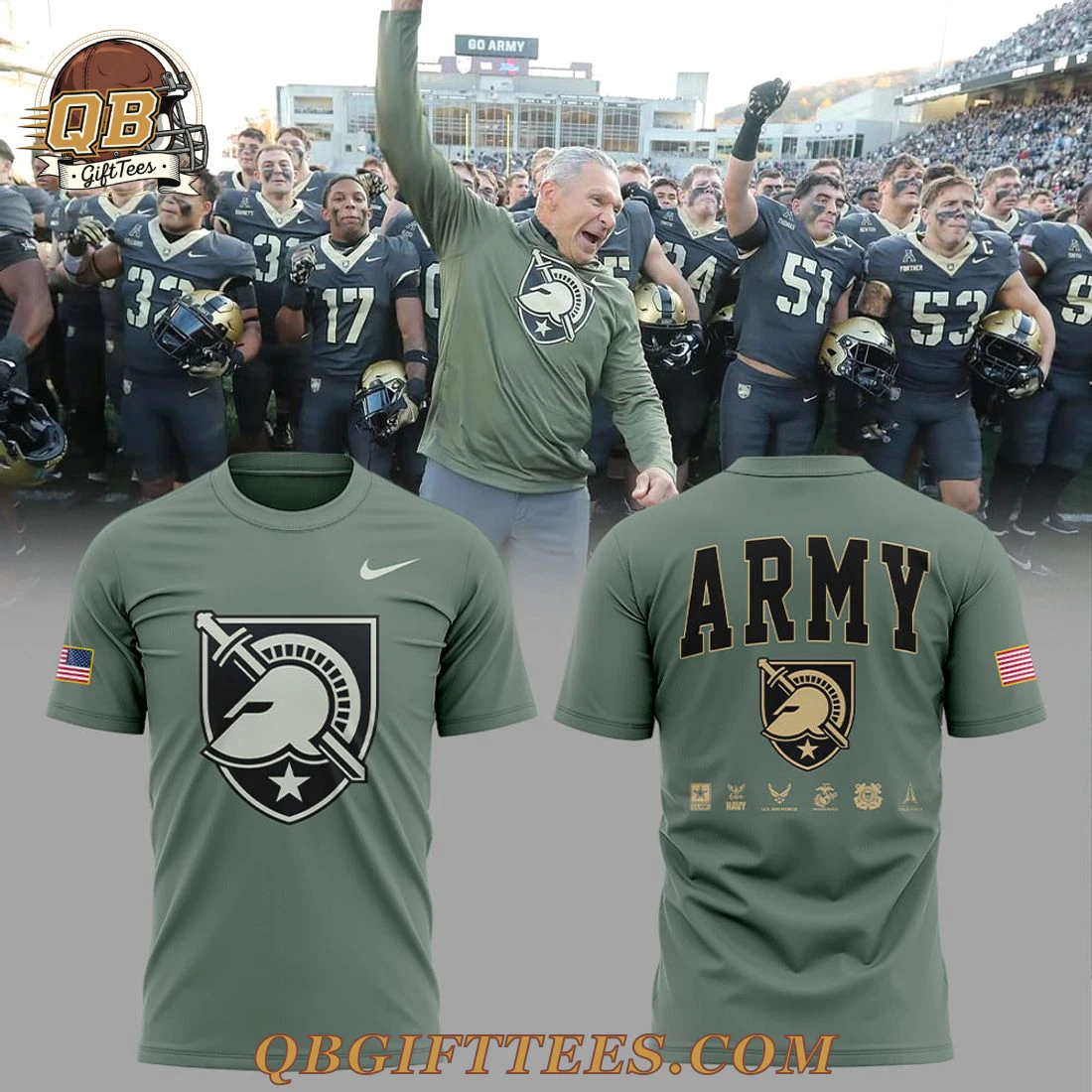 For every dedicated Army Black Knights supporter, the Army Black Knights Coach Smile Says It All 2025 Edition Hoodie captures a moment of undeniable triumph and the spirit of victory that defines our team. This hoodie offers a comfortable way for fans of all ages to showcase their pride, from alumni to current students and families. Crafted in a classic olive green hue, the front prominently features the iconic Army Black Knights shield logo, depicting a knight’s helmet with a star and sword, centered below a subtle white swoosh on the upper right chest. It includes a spacious kangaroo pocket and adjustable drawstrings for the hood. The back proudly displays “ARMY” in bold black and gold lettering, with a smaller Army Black Knights shield logo beneath it. Each sleeve features an American flag patch, and a line of additional service branch emblems (Army, Navy, Air Force, Marines, Coast Guard) is subtly placed below the main back graphic, honoring all who serve. This garment is made from a durable 80% cotton, 20% polyester fleece blend, offering a mid-weight feel at approximately 9 oz/sq yard (305 gsm) and a classic, relaxed fit.