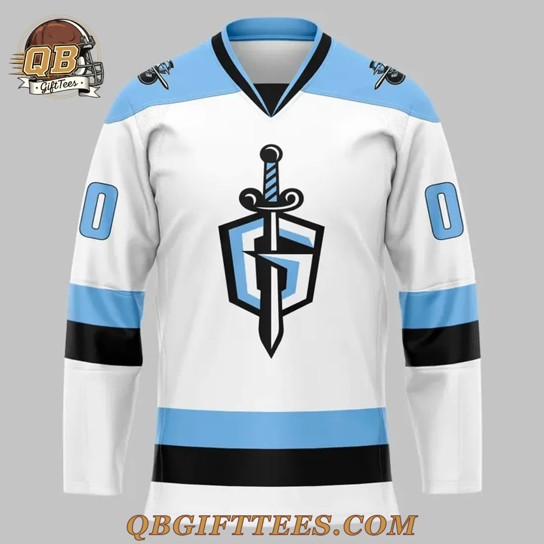 For dedicated fans of the Atlanta Gladiators, the Atlanta Gladiators Frenzy Limited Edition Jersey offers a distinctive way to showcase your passion for the team. This jersey features a clean, predominantly white body accented with light blue and black details. The front presents a V-neck design trimmed in black, leading down to a prominent central emblem: a stylized black “G” shield with a light blue outline, impaled by a black sword. Light blue shoulder yokes are adorned with smaller, dynamic gladiators helmet logos in white and blue on each side. The sleeves display a striking light blue stripe positioned above a black stripe on the forearms, complemented by a single “0” in light blue on each shoulder. The reverse side maintains the white body, featuring a light blue shoulder yoke with a black “AK” logo. Below this, “ANY NAME” is displayed in light blue, centered above large light blue numbers “00,” offering customization potential. A matching light blue stripe above a black stripe wraps around the lower back. Crafted from 100% breathable polyester mesh fabric, this jersey weighs approximately 190 GSM, designed for comfort and durability.