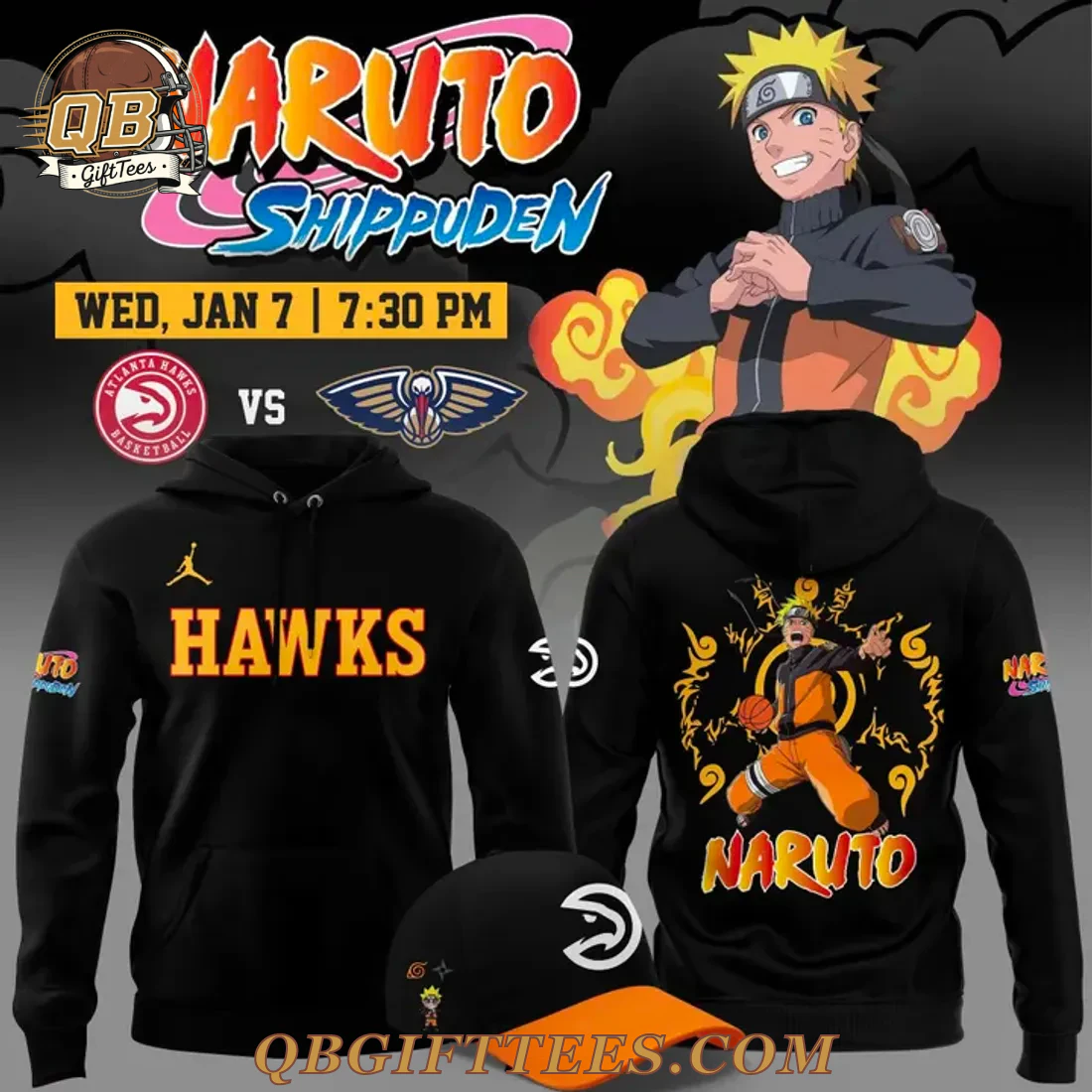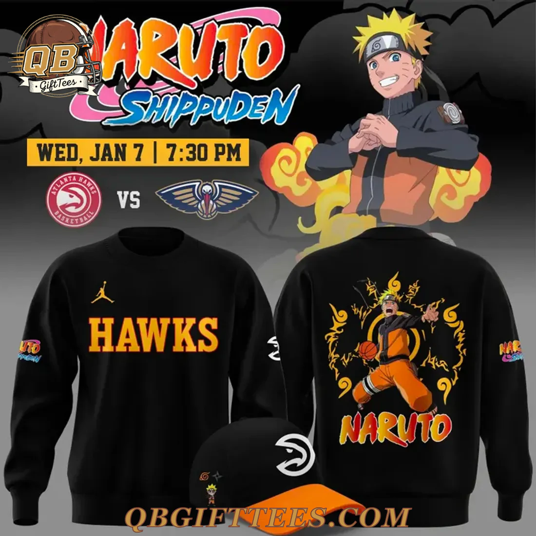 The Atlanta Hawks x Naruto 2026 Edition T-Shirt brings together the dynamic energy of the Atlanta Hawks and the unwavering spirit of Naruto Shippuden, celebrating shared themes of perseverance and community. Designed for fans who champion both on-court action and ninja adventures, this black T-shirt features bold graphics that bridge two beloved worlds. The front showcases “HAWKS” prominently across the chest in striking gold lettering, beneath the iconic gold Jumpman logo. On the left sleeve, the classic Naruto Shippuden logo is displayed, while the right sleeve features the Atlanta Hawks team emblem. The back of the shirt presents a large, vibrant illustration of Naruto Uzumaki himself, depicted in his signature orange jumpsuit, actively dribbling a basketball, encircled by an electrifying golden chakra aura. Below this dynamic imagery, the “NARUTO” text is rendered in an eye-catching orange and red gradient. Crafted from a premium 100% pre-shrunk cotton fabric, this mid-weight (approximately 5.3 oz/sq yd) Atlanta Hawks x Naruto 2026 Edition T-Shirt offers a comfortable, regular fit designed for everyday wear, available in standard adult sizing.