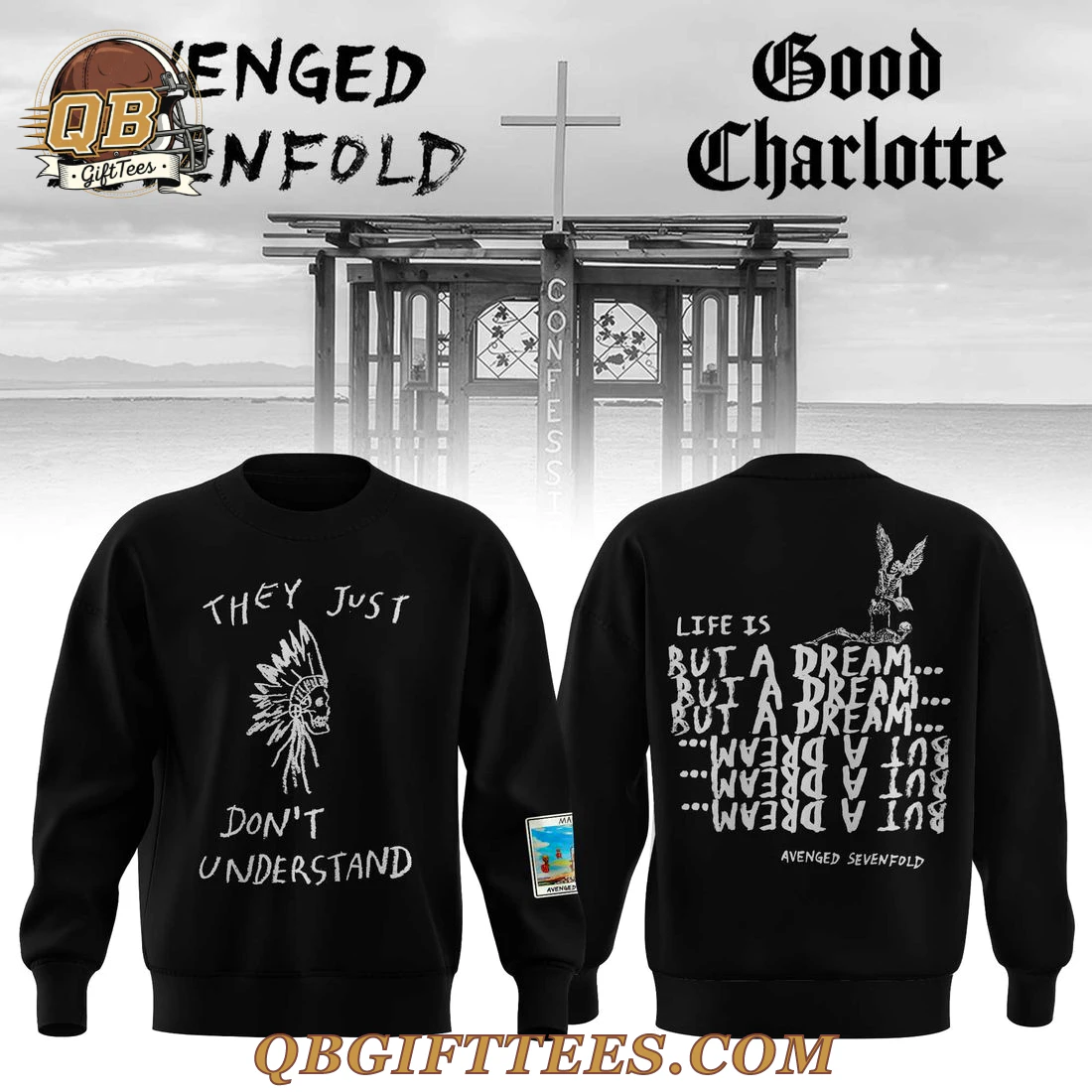 This Avenged Sevenfold x Good Charlotte Tour Limited Edition Hoodie is a distinctive piece designed for fans who appreciate the enduring impact of both bands across rock and alternative genres. The front of the hoodie features stark white text reading “THEY JUST DON’T UNDERSTAND” above a detailed white graphic of a skull adorned with a feathered headdress, encapsulating a defiant spirit. On the reverse, an inverted, repeating lyrical passage “LIFE IS BUT A DREAM…” is printed in white, complemented by a white winged figure and “AVENGED SEVENFOLD MAGIC” text at the top right, with “AVENGED SEVENFOLD” at the bottom. A small, vibrant rectangular patch depicting a serene beach scene with a pier under a blue sky is affixed to the right sleeve. Crafted from a durable and comfortable 80% cotton / 20% polyester blend fleece*, this hoodie offers a substantial feel with an approximate fabric weight of 8.5 oz/yd² (280 gsm). It features a classic pullover design with a functional drawstring hood and a front kangaroo pocket, all in a deep black finish contrasting with the bold white graphics.
