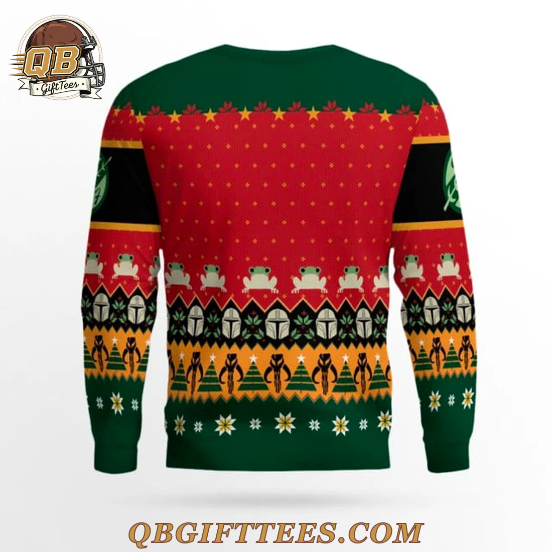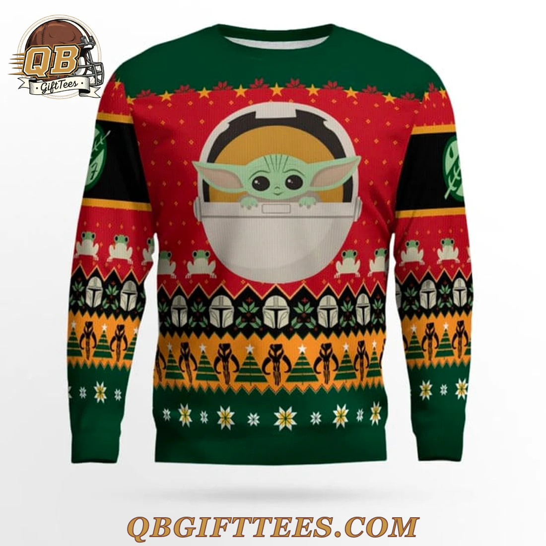 Embrace the holiday spirit with the beloved foundling from a galaxy far, far away in our Baby Yoda Grogu Christmas Limited Edition Ugly Sweater. This festive garment connects fans of The Mandalorian with a whimsical seasonal design. The front features a prominent image of Grogu peeking from his Hoverpram, centered on a vibrant red background accented with subtle golden dots. Above, a deep green yoke is adorned with scattered golden star motifs. The lower half showcases repeating horizontal bands of holiday-themed patterns: rows of small green frogs, iconic Mandalorian helmets, and alternating Christmas trees with what appear to be mudhorn-inspired symbols. Green sleeves feature a black band on the upper arm with a circular green, stylized emblem. The back design mirrors the intricate patterns of the front, excluding the central Grogu image, maintaining the red background, green yoke, and festive bands. This crew-neck, long-sleeve knit sweater is crafted from 100% polyester knit fabric, offering a mid-weight feel suitable for festive gatherings. It’s available in various standard sizes, ensuring a comfortable fit.