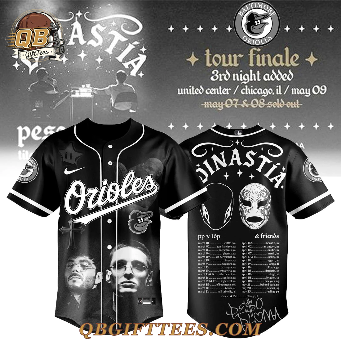 Celebrate the dynamic fusion of music and sport with the Baltimore Orioles x Peso Pluma Dinastía Tour 2026 Baseball Jersey, a unique collectible for fans of both the Orioles and Peso Pluma. This black baseball jersey features a full button-down front with white buttons and crisp white piping along the placket and collar. Across the chest, “Orioles” is prominently displayed in a bold white script, underlined by a white graphic resembling a baseball bat, set against two black and white portraits of Peso Pluma and another artist. A subtle dark cross emblem is visible behind the script. The left sleeve carries the iconic Baltimore Orioles cartoon bird logo within a circular grey and black emblem, while the right sleeve showcases a white swoosh above a black star graphic with white eyes. The back of the jersey features “DINASTÍA” in a stylized white script with accompanying stars, above two distinctive white luchador-style mask graphics. Below these elements, a detailed list of tour dates and locations is printed, culminating in a stylized “Peso Pluma” signature in white graffiti script. Crafted from a lightweight, breathable 100% polyester athletic fabric, this jersey is designed for comfort and lasting wear, offering a relaxed fit suitable for various body types.