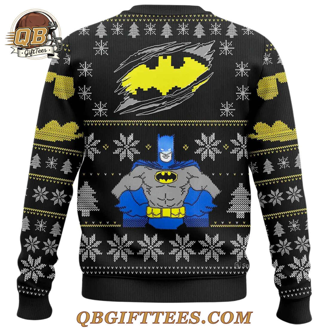 For fans who celebrate the enduring legacy of Gotham’s protector, the Batman Chrismats Limited Edition Ugly Sweater offers a unique way to combine festive cheer with iconic fandom. This black base knit sweater features a detailed pixelated design across both the front and back. The front prominently displays a large yellow Batman emblem, situated above a classic depiction of Batman in his grey and blue suit, complete with a yellow utility belt. The design is further enhanced with white snowflakes, yellow cloud motifs, and white Christmas trees, all framed by decorative chevron and V-pattern borders at the collar, cuffs, and hem. On the reverse, a striking “ripped” effect reveals a yellow Batman emblem, mirroring the hero’s steadfast presence, again accompanied by the pixelated Batman figure and festive elements. Crafted from a soft-knit acrylic blend, this sweater provides a comfortable fit suitable for holiday gatherings. Its medium-weight knit offers warmth without bulk, designed for standard adult sizing.
