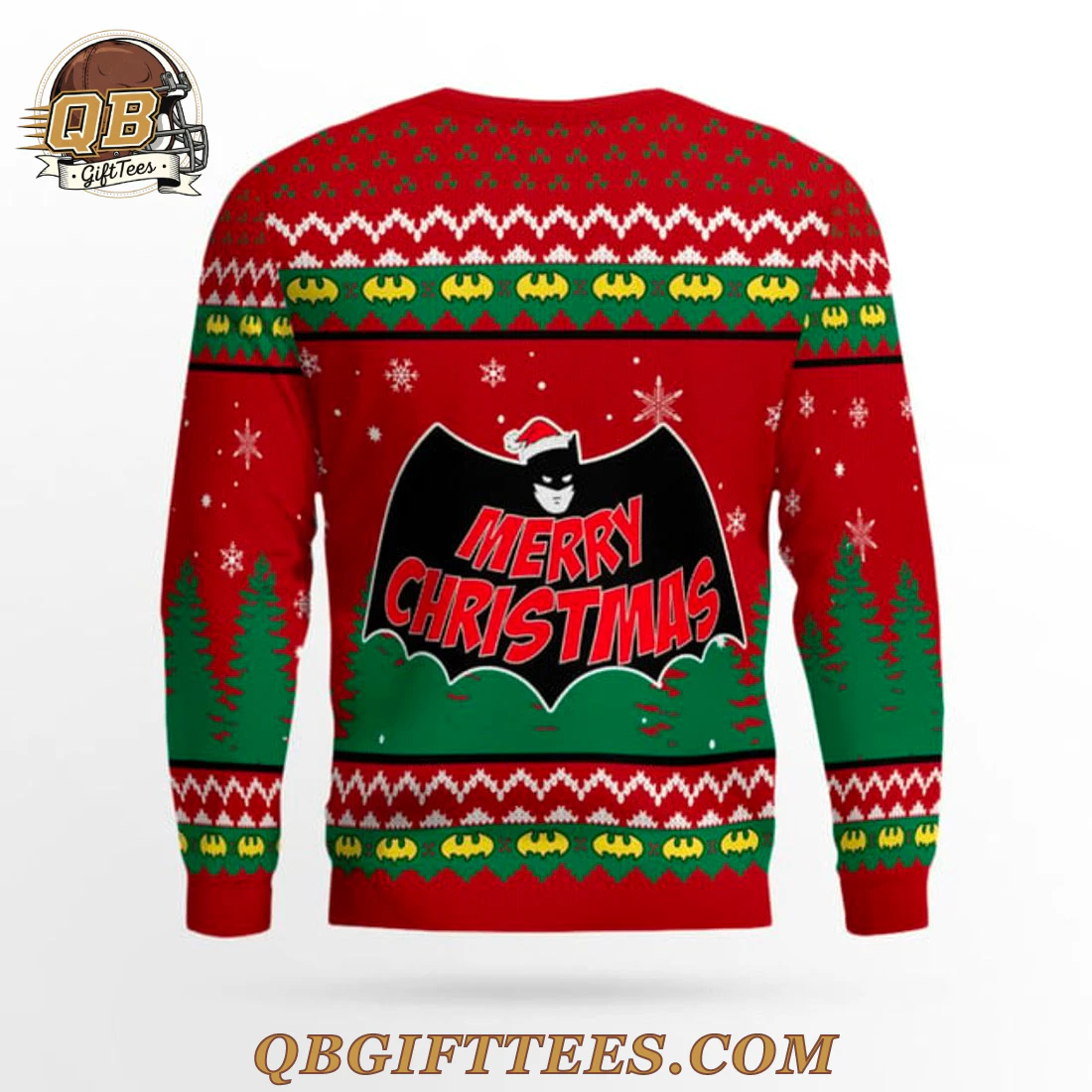 For fans who celebrate the Caped Crusader even during the festive season, the Batman Christmas Limited Edition Ugly Sweater offers a unique way to combine holiday cheer with Gotham’s protector. This vibrant red, mid-weight knit sweater features Batman prominently on the front, sporting his blue cowl and gloves, while wearing his own red Christmas sweater adorned with a bat symbol, holding a steaming white mug. Flanked by green Christmas trees and falling snowflakes, the design includes horizontal patterns of white zigzag lines, alternating green and yellow bat symbols, and “BATMAN CHRISTMAS” text at the bottom hem. The reverse showcases a large, stylized black bat symbol wearing a Santa hat, emblazoned with “Merry Christmas” in white text, set against a backdrop of red, green trees, and snowflakes. Crafted from a premium polyester blend, this sweater provides a comfortable, breathable fit suitable for holiday events. Detailed sizing charts are available on the product page to ensure an accurate fit.