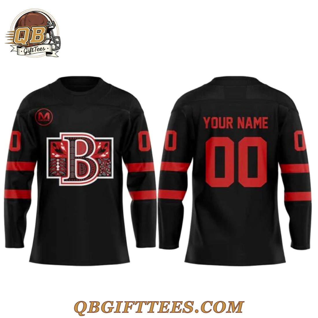 For dedicated fans of the Belleville Senators, the Belleville Senators Indigenous Community Night 2026 Custom Name Jersey represents more than just team apparel; it’s a meaningful connection to community and heritage, celebrating the rich culture recognized on this special night. This custom jersey is primarily black, featuring prominent red and white accents. The front proudly displays a large stylized “B” emblem, intricately designed with traditional Indigenous art patterns in white, red, and black, making it a unique statement piece. On the left shoulder, a circular “M” logo in red and white adds to the design details. Bold red stripes wrap around the sleeves, complementing the overall aesthetic. Crafted from a durable, breathable hockey-grade polyester blend, this jersey offers a comfortable, relaxed fit designed for both active support and casual wear. The fabric weight is consistent with quality sports apparel, ensuring a lasting garment.