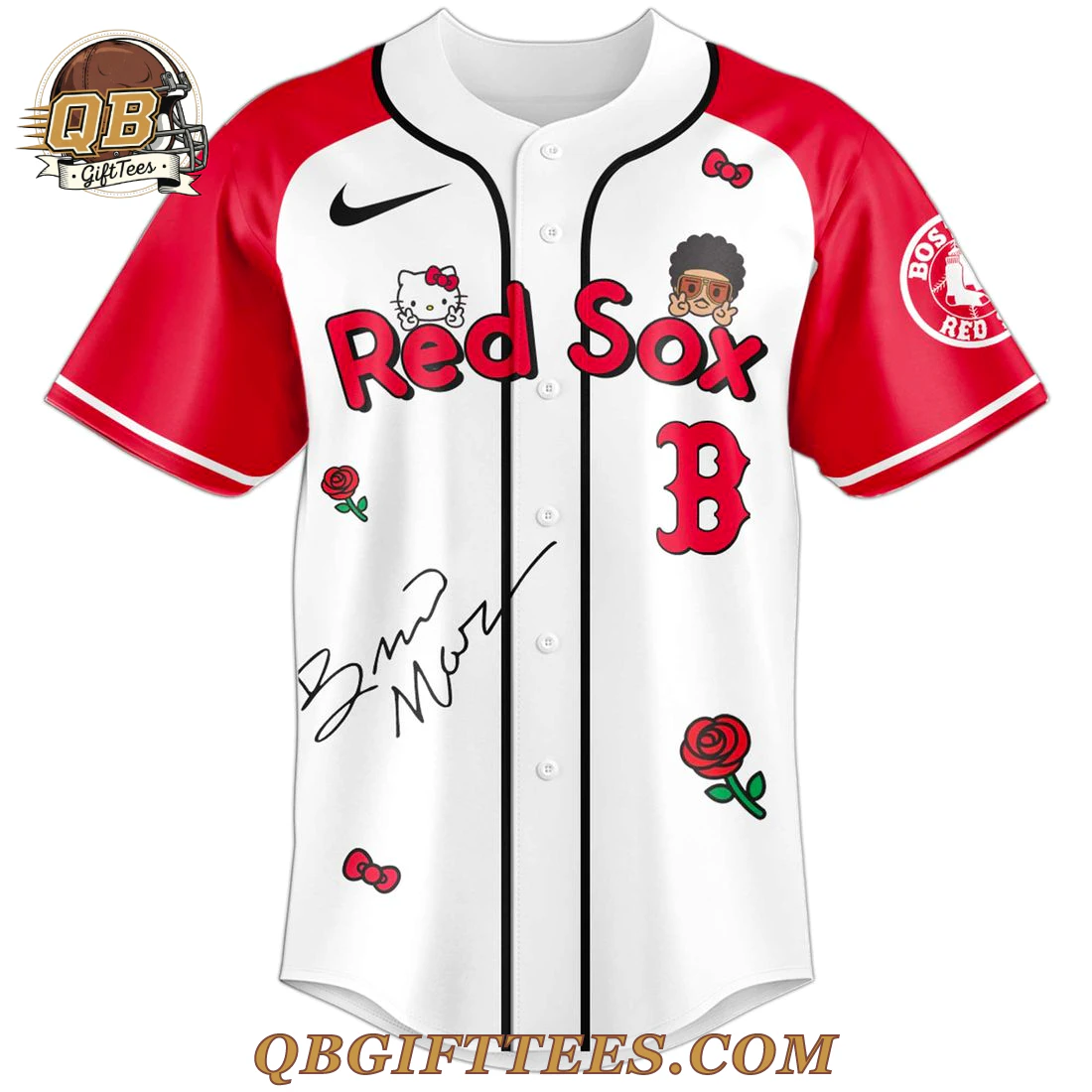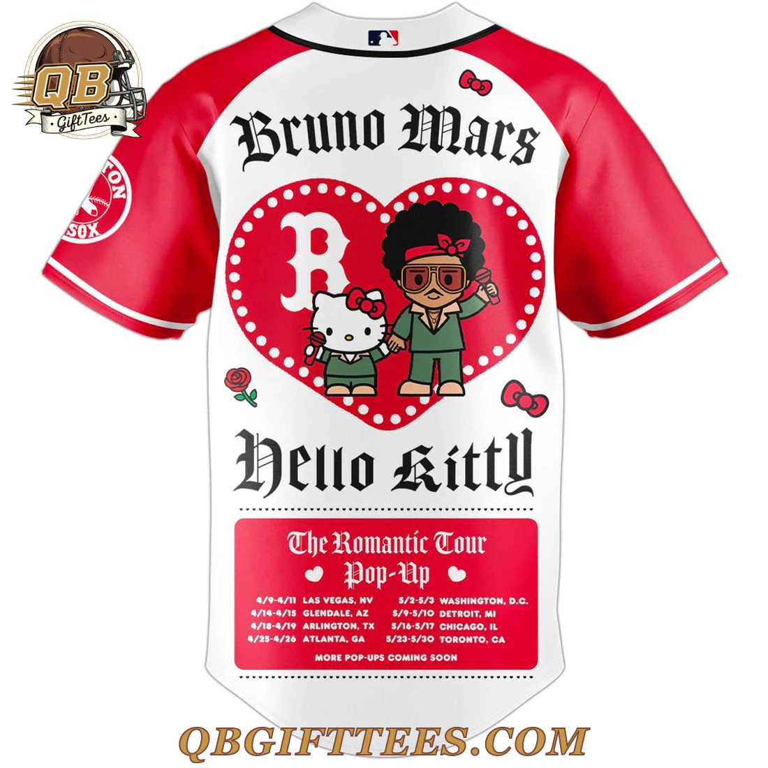The Boston Red Sox x Bruno Mars & Hello Kitty 2026 Edition Baseball Jersey bridges the worlds of iconic baseball, Grammy-winning music, and beloved pop culture, appealing to diverse fan bases. This unique collectible features a white body with contrasting red raglan sleeves and black piping along the front button placket. The chest prominently displays “Red Sox” in red lettering, with Hello Kitty peeking from the ‘R’ and a cartoon Bruno Mars from the ‘S’. A red “B” logo and a black swoosh adorn the front, alongside a stylized black Bruno Mars signature and scattered red roses and Hello Kitty bows. The left sleeve features the classic Boston Red Sox circular patch. The back of the jersey showcases “Bruno Mars” in an ornate black font, centered above a large red heart containing a red “B” logo, Hello Kitty, and Bruno Mars figures. “Hello Kitty” is stylized below, with “The Romantic Tour Pop-Up” schedule at the bottom. Constructed from premium, moisture-wicking polyester fabric, this jersey offers both comfort and durability, weighing approximately 200-220 GSM for a quality, mid-weight feel. All embellishments are expertly sublimated or stitched for lasting detail.