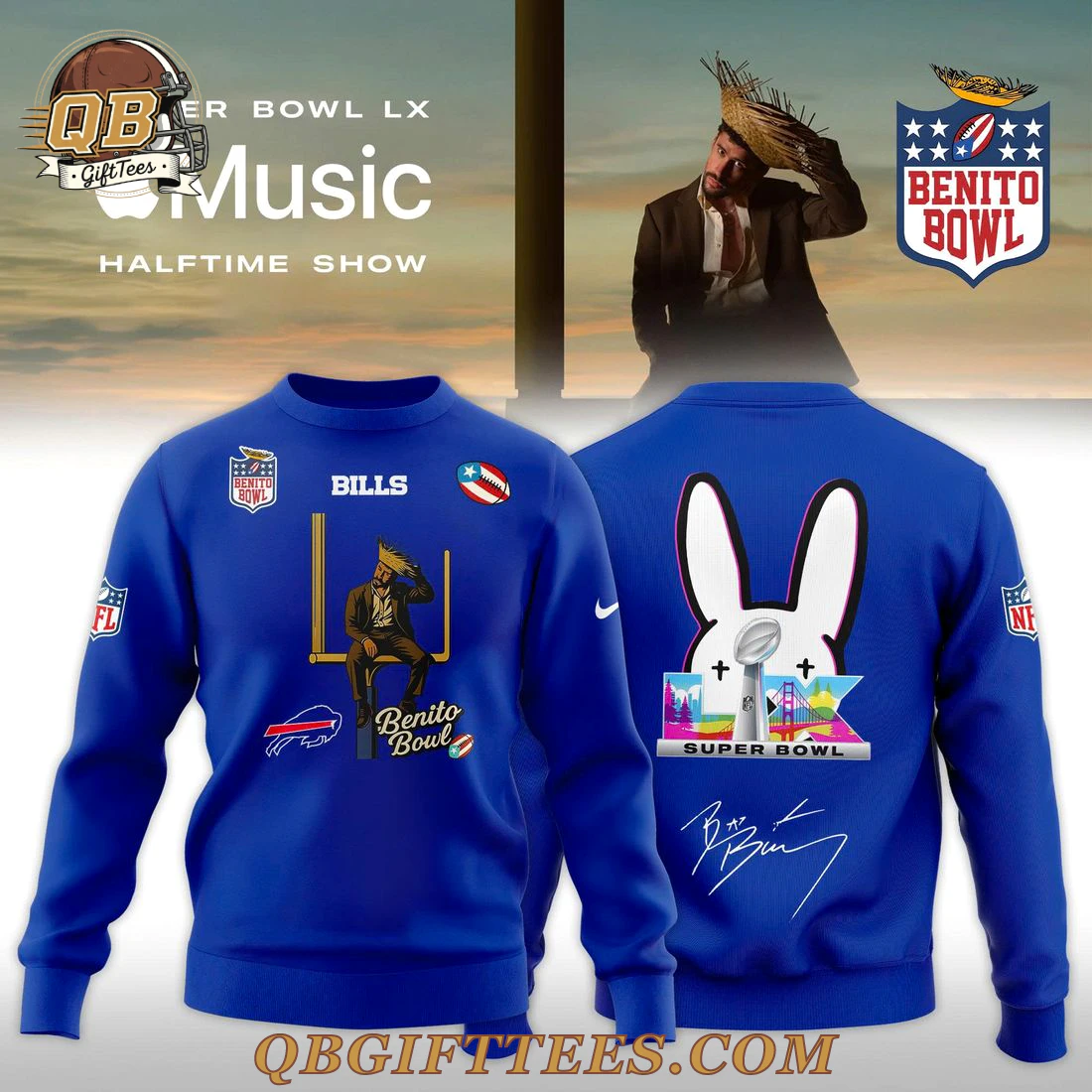 This Buffalo Bills x Bad Bunny 2026 Super Bowl LX Halftime Show Blue Hoodie captures a hypothetical monumental moment, connecting the passionate fanbases of both the Buffalo Bills and music icon Bad Bunny. The vibrant blue hoodie features a dynamic front design. On the left sleeve, the official NFL shield is present, while the swoosh logo adorns the right. The upper left chest proudly displays a unique “Benito Bowl” logo, a playful take on the NFL shield, alongside “BILLS” text. A Puerto Rican flag-themed football is seen on the upper right chest. Central to the front is an artistic illustration of Bad Bunny, in a suit and straw hat, seated atop a golden goalpost. The Buffalo Bills logo appears on the lower left, with “Benito Bowl” and a heart-emblazoned football on the lower right. Large, bold “BILLS” lettering anchors the design at the bottom. The back of the hoodie showcases a large white rabbit head, a signature Bad Bunny motif, framing the iconic Super Bowl trophy. Below this, a colorful geometric cityscape and “SUPER BOWL” text are displayed, finished with an artistic signature. This hoodie is constructed from a premium 8 oz/yd² (270 gsm) cotton-polyester fleece blend, offering both warmth and durability. It features a standard unisex fit and a drawstring hood, ensuring comfort.