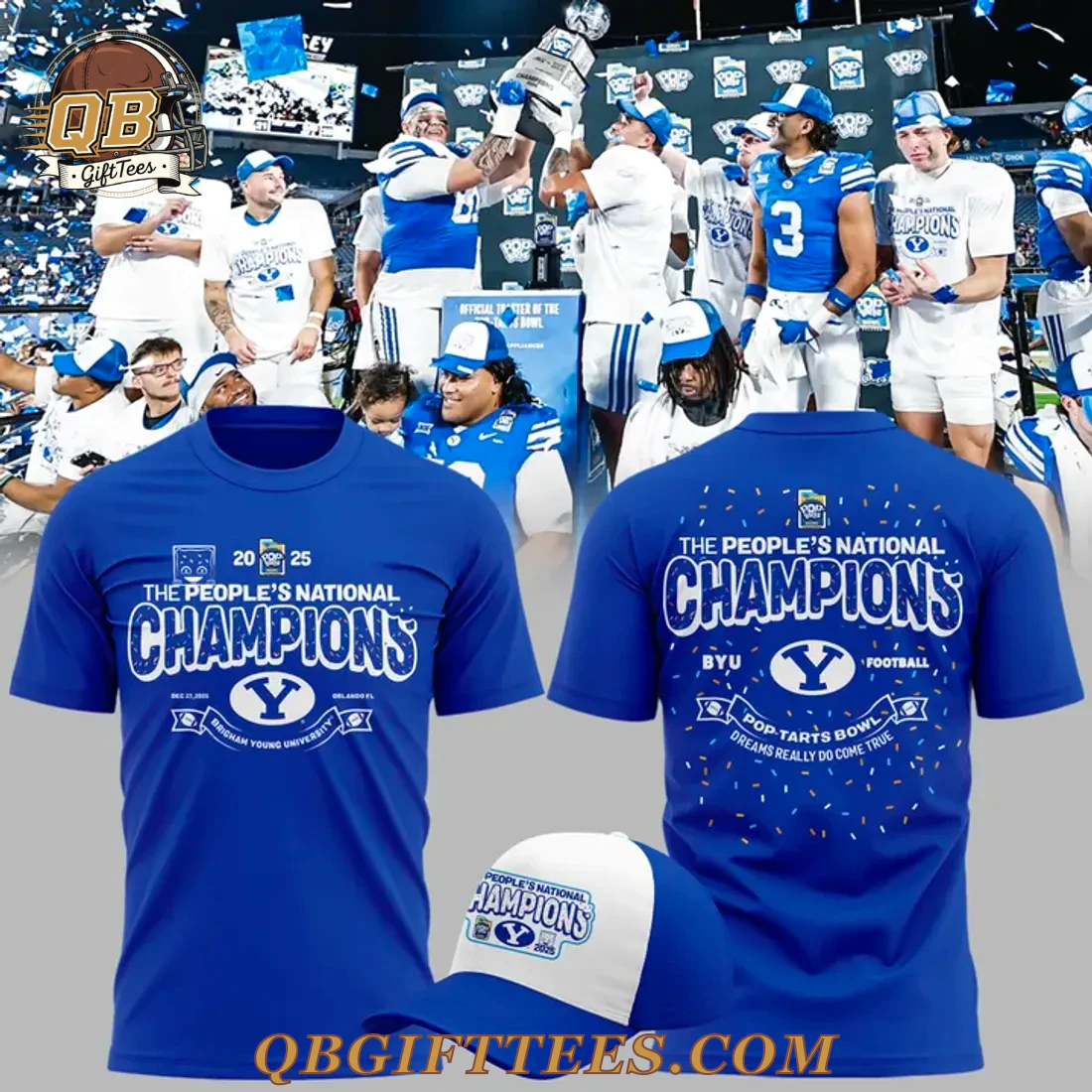 This BYU Cougars POP-TARTS Bowl Champions Limited Edition Hoodie offers loyal fans a vibrant way to celebrate their team. The royal blue hoodie features a prominent front design, centered with bold white text declaring “THE PEOPLE’S NATIONAL CHAMPIONS,” where “CHAMPIONS” has a distinctive distressed texture. Below this, “BYU FOOTBALL” flanks the iconic BYU ‘Y’ emblem, all in white. The bottom of the front graphic includes “DEC 28, 2023 | ORLANDO FL | BRIGHAM YOUNG UNIVERSITY.” The back design mirrors the “THE PEOPLE’S NATIONAL CHAMPIONS BYU FOOTBALL” text and ‘Y’ emblem, uniquely adding “POP-TARTS BOWL” and “DREAMS REALLY DO COME TRUE” against a background of colorful confetti-like sprinkles. This hoodie is constructed from a soft, medium-weight cotton-polyester fleece blend, providing both comfort and durability. It includes a classic front pouch pocket, adjustable drawstrings, and ribbed cuffs and hem for a comfortable, secure fit.