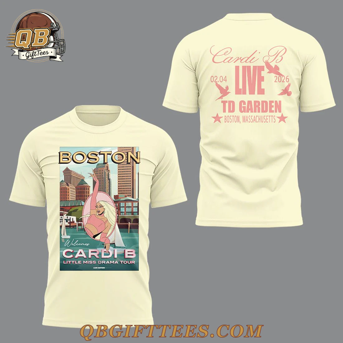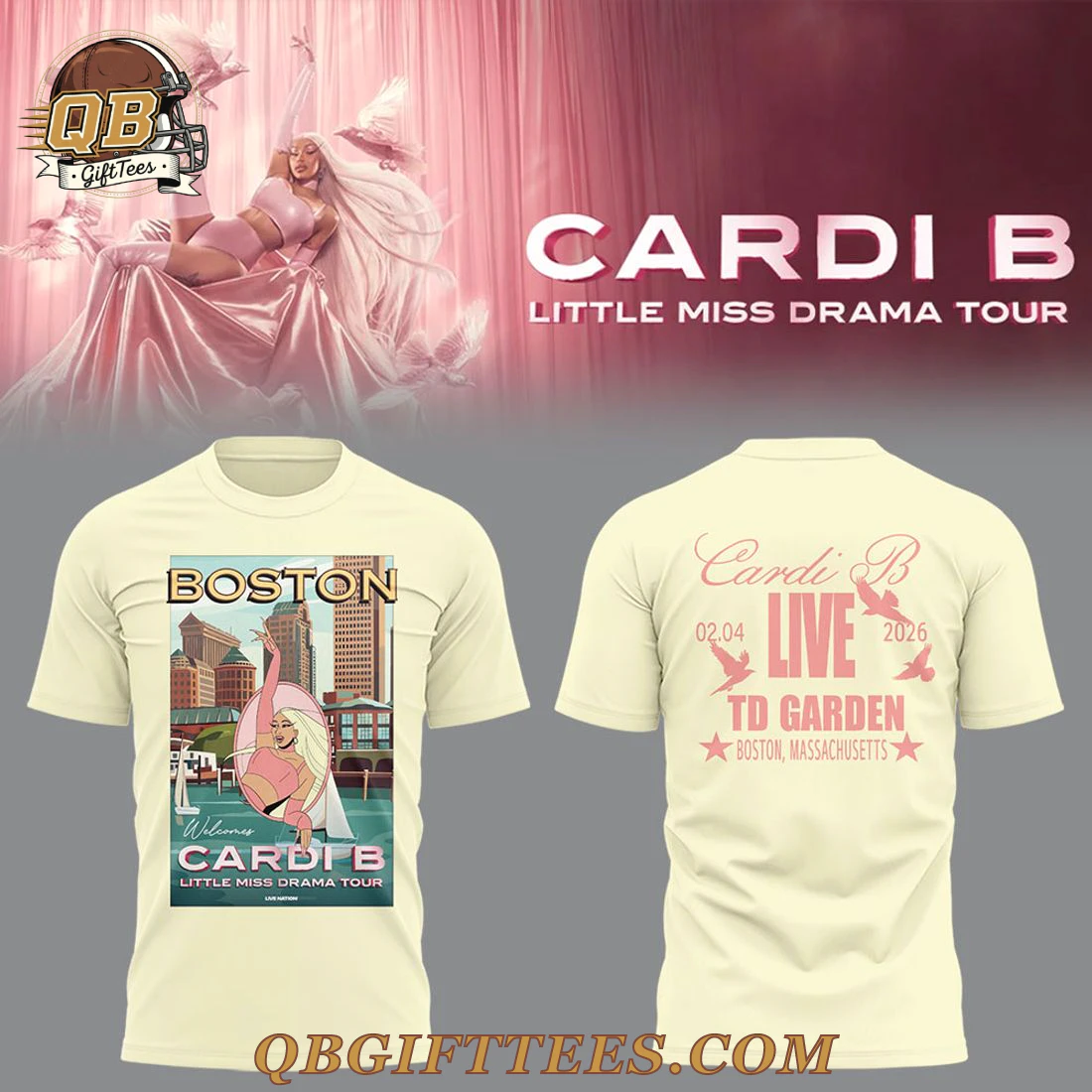 For fans who live and breathe the energy and unparalleled style of Cardi B, the Cardi B The Little Miss Drama Tour 2026 Edition Hoodie is a vibrant memento of an unforgettable experience. This hoodie captures the tour’s unique flair, appealing to both long-time devotees and those new to her iconic artistry. The front features a colorful, vintage travel poster-style graphic showcasing a depiction of the Boston city skyline, with “BOSTON” prominently displayed. At its heart is a playful, cartoon-inspired illustration of Cardi B herself, gracefully posed on what appears to be a boat or raft, accompanied by the inviting text, “Welcome to Cardi B Little Miss Drama Tour.” The overall base color of the hoodie is a light, natural cream. The reverse side proudly displays “Cardi B LIVE” in a bold pink script, framed by the date “02.04 2026” and adorned with a pair of delicate bird silhouettes. Below this, “TD GARDEN BOSTON, MASSACHUSETTS” is emblazoned, completing the concert specific details. This hoodie is crafted from a premium cotton-blend fleece, offering a comfortable mid-weight feel suitable for various climates. The fabric weight is approximately 8 oz (270 gsm), providing warmth without bulk, and it features a classic kangaroo pocket and adjustable drawstring hood.