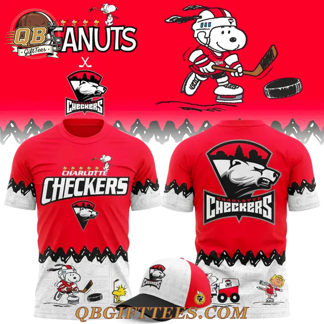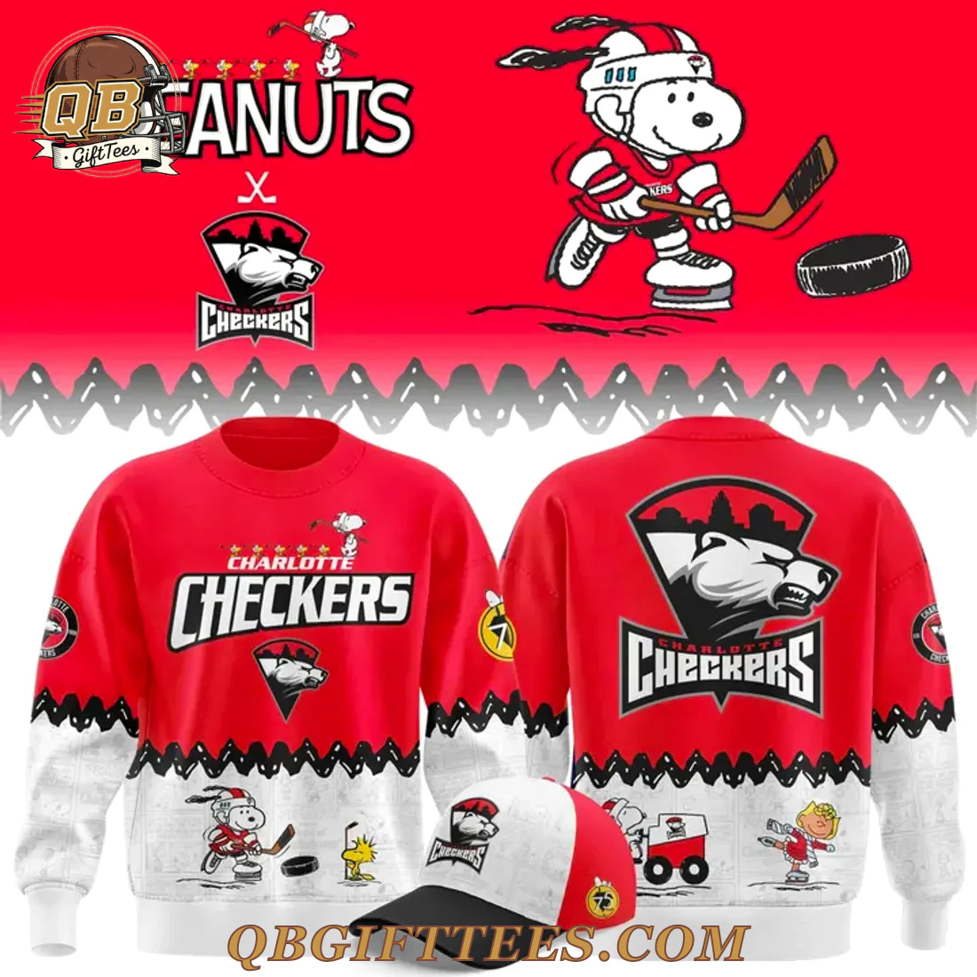 For fans who cherish both the thrill of hockey and the timeless charm of Peanuts, the Charlotte Checkers x Peanuts Night Snoopy 2026 Edition Hoodie brings two beloved worlds together. This exclusive hoodie features a vibrant red body contrasted with a classic black hood and drawstring. On the front, the bold “CHARLOTTE CHECKERS” text is prominently displayed in white with a black outline, accompanied by the iconic Charlotte Checkers bear logo. Below, Snoopy, fully geared up for the ice, skates dynamically on the left hip, partially covering the kangaroo pocket. The sleeves transition to white, adorned with a playful pattern of Peanuts comic strip panels separated by a distinctive black wavy line. The reverse of the hoodie proudly showcases the detailed Charlotte Checkers bear logo set against a backdrop of the city skyline, while the lower back continues the white pattern featuring various Peanuts characters enjoying hockey-themed antics, also divided by the signature wavy line. Constructed from a premium blend of 50% cotton and 50% polyester fleece, this hoodie offers a soft, medium-weight feel (approx. 8 oz/270 gsm) for comfortable wear.