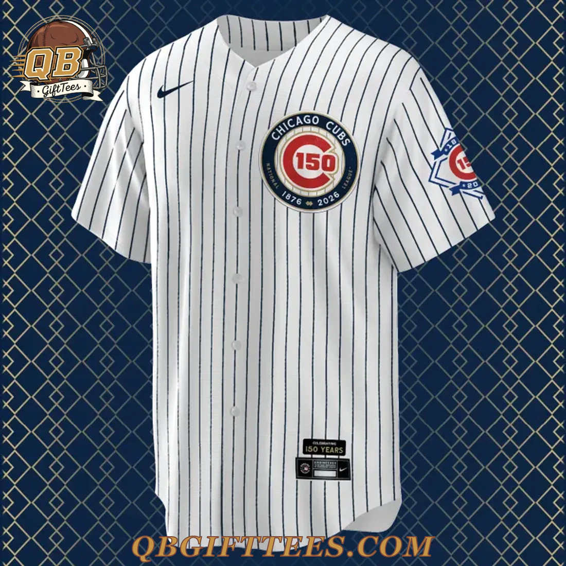 For generations of fans, the Chicago Cubs 150th Anniversary Special Edition Baseball Jersey commemorates a century and a half of iconic baseball history, offering a tangible connection to the team’s enduring legacy. This authentic jersey presents a classic white base with crisp navy blue pinstripes. On the front, the left chest bears a black Swoosh logo, while the center proudly displays a circular 150th Anniversary emblem. This emblem features “CHICAGO CUBS” at the top, “NATIONAL LEAGUE 1876-2026” at the bottom, all encircling a bold red “150” numeral. The right sleeve showcases a blue and red shield patch, depicting a baseball diamond with a “150” and the Cubs “C” logo. The reverse side features the iconic MLB Batterman logo below the collar and is designed for personalization, showing “ANY NAME” and “00” in navy blue with a gold outline as an example. Crafted from a lightweight, moisture-wicking 100% polyester knit fabric, this jersey provides an athletic cut for optimal comfort and lasting wear. A woven jock tag indicating “150th ANNIVERSARY 1876-2026” is visible at the lower left hem.
