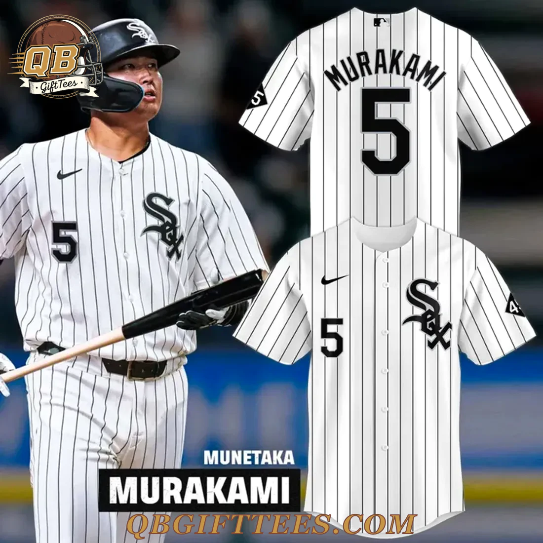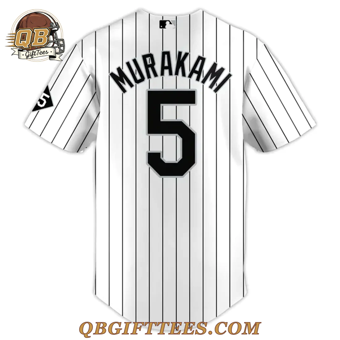 For fans who appreciate exceptional talent and the rich history of baseball, the Chicago White Sox Munetaka Murakami Limited Edition Baseball Jersey offers a distinctive way to express that passion. This collector’s item features the classic white base with crisp black pinstripes, reminiscent of the White Sox’s iconic home uniforms. The front proudly displays a black swoosh on the upper right chest, with a bold black numeral ‘5’ positioned on the left. The signature black White Sox ‘Sox’ emblem with its stylized ‘S’ is prominently placed on the right chest. On the reverse, the name ‘MURAKAMI’ is arched above a large, striking black numeral ‘5’. A small, generic baseball league logo outline is visible at the back neck collar. A unique detail, a black triangular patch with a white ‘5’, adorns the left sleeve. This jersey is crafted from a durable, lightweight 100% polyester fabric, engineered for comfort and breathability, typically weighing around 5-6 oz per square yard. Each jersey is produced to standard adult sizing, with dimensions varying by size from approximately 28 inches in length (small) to 34 inches (XXL) and chest widths from 20 inches to 28 inches.