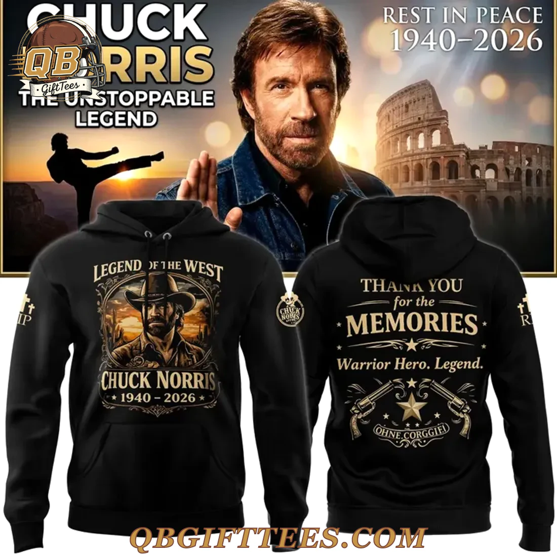 For fans who appreciate the enduring legacy of an action icon, the Chuck Norris Thank You For The Memories Limited Edition T-Shirt offers a direct way to honor his remarkable career. This commemorative black crew neck t-shirt features a striking design on both the front and back. The front proudly displays “LEGEND OF THE WEST” above a detailed, framed portrait of Chuck Norris in a cowboy hat, rendered in shades of gold and brown. Below the portrait, the text “CHUCK NORRIS 1940-2026” is prominently featured. The back of the shirt carries the heartfelt message “THANK YOU for the MEMORIES” in bold lettering, followed by “Warrior. Hero. Legend.” and an emblem featuring two revolvers flanking a star with “OHNE CORGGIEL” beneath it. A small cross with “RIP” is visible on the left sleeve. Crafted from a premium, pre-shrunk 100% ring-spun cotton fabric with a substantial 5.3 oz/yd² (180 g/m²) weight, this t-shirt provides a soft, breathable, and comfortable fit.
