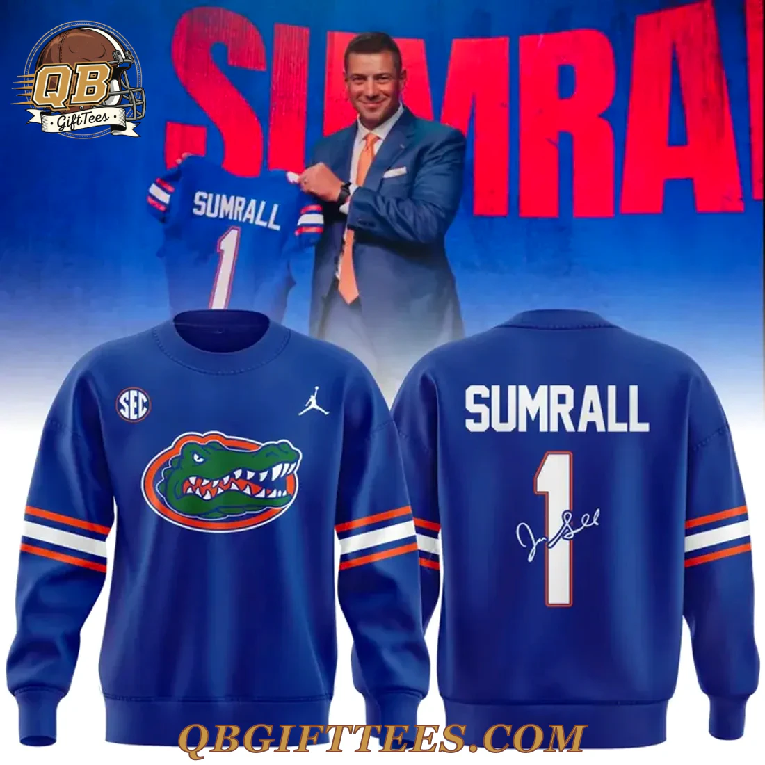 Celebrate a new era for Florida Gators Football with the Coach Jon Sumrall Florida Gators Football for fans Edition Hoodie. This hoodie connects fans across generations, from long-time season ticket holders to new students, to the excitement surrounding Coach Sumrall’s arrival. The hoodie features a vibrant royal blue base. On the front, a prominent, classic Florida Gators oval logo with the alligator head is centrally displayed, flanked by a small SEC patch on the upper left chest and a white Jordan Jumpman logo on the upper right. Both sleeves showcase distinctive white and orange stripe details, while a spacious kangaroo pocket offers practical storage. The back proudly displays ‘SUMRALL’ in bold white lettering above a large white ‘1’, symbolizing his integral role, with a replicated signature directly below. Crafted from a premium 80% cotton, 20% polyester blend, this mid-weight fleece hoodie (approximately 8.5 oz/yd²) provides a comfortable, athletic fit, perfect for showcasing your Gator pride.
