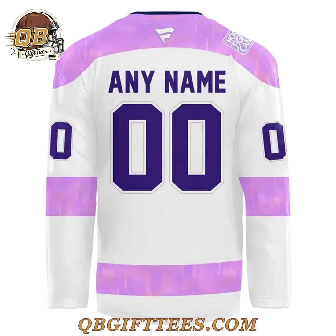 For every Colorado Avalanche fan, the Colorado Avalanche Cancer Night 2025 Edition Jersey represents more than just team pride; it’s a powerful statement of solidarity and support for a vital cause that touches countless lives. This special edition jersey features a crisp white base, elegantly accented with soft lavender and deeper lilac shades across the shoulder yokes, sleeve cuffs, and lower body stripe, all subtly detailed with a unique, textured pattern. The front proudly displays the iconic Colorado Avalanche ‘A’ logo, reimagined in a flowing purple design, centered beneath the NHL shield at the collar and a Fanatics logo on the right chest. Sleeves feature a “0” placeholder, signifying customization potential, matching the bold purple numbers. Crafted from durable, breathable polyester fabric, this Colorado Avalanche Cancer Night 2025 Edition Jersey offers a comfortable, lightweight fit ideal for any fan.