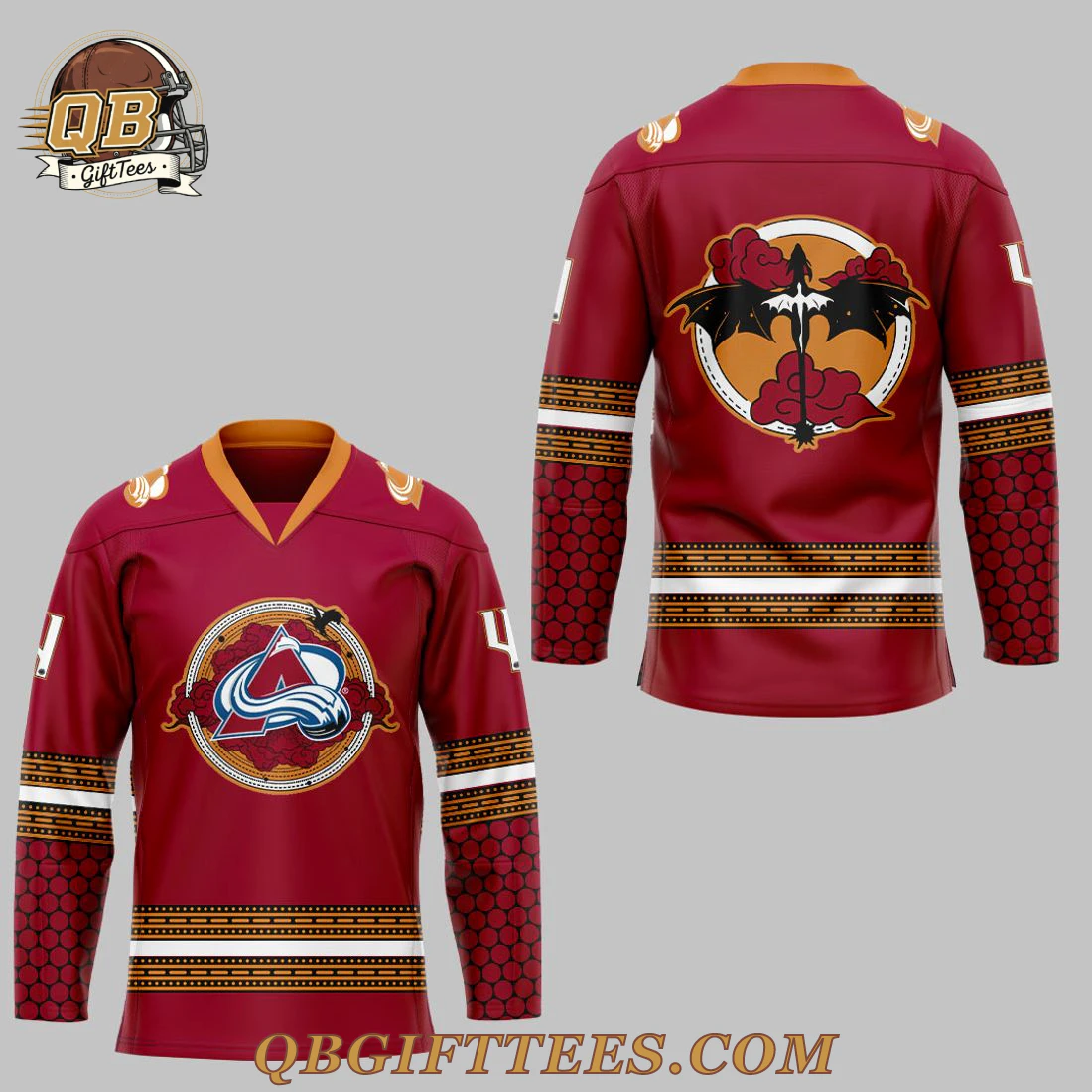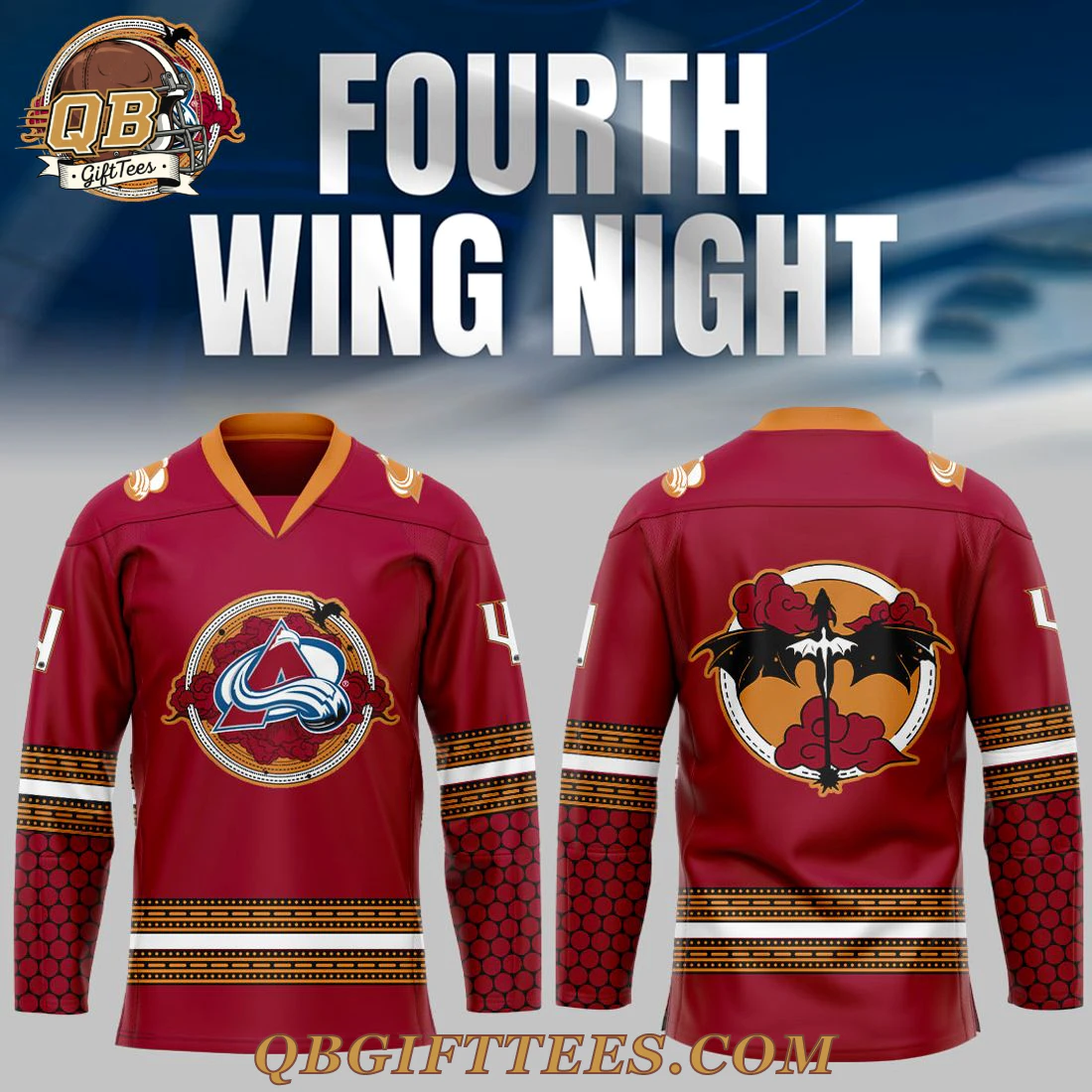 Embrace your dual passion for Avalanche hockey and the thrilling world of Fourth Wing with this exceptional Colorado Avalanche Fourth Wing Night Limited Edition Jersey. This unique fan collectible features a rich burgundy base color, accented by an orange V-neck collar. The front proudly displays the iconic Colorado Avalanche logo, intricately framed within a gold and brown circular design that hints at dragon scales. White and gold striped bands adorn the upper sleeves, complementing the distinct hexagonal scale pattern in a darker red on the forearms, along with a white numeral-like graphic on the upper arm. The back showcases a captivating circular emblem featuring a dark dragon with widespread wings, emerging from fiery orange clouds against a lighter orange background. Crafted from 100% premium polyester knit fabric, this jersey offers a comfortable mid-weight feel and boasts durable double-stitched seams*.