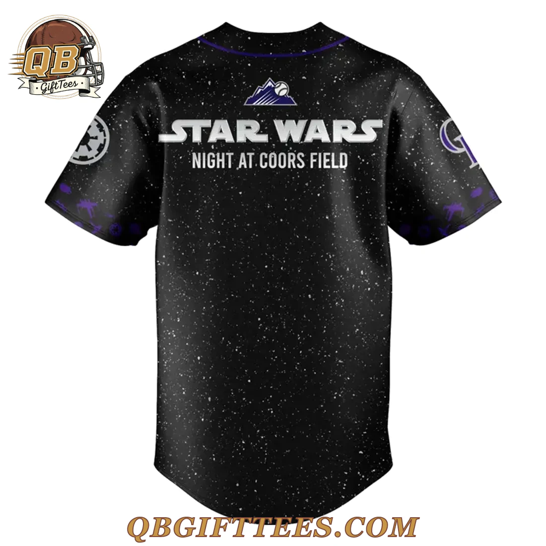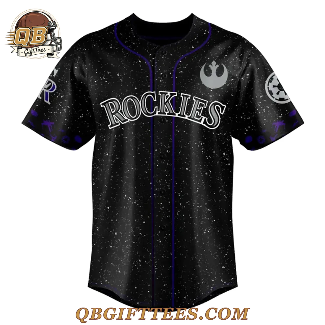 For fans who celebrate both galactic adventures and America’s favorite pastime, the Colorado Rockies 2026 Star Wars Night Edition Custom Name Jersey offers a unique convergence of passions. This jersey captures the spirit of the special event, appealing to long-time Rockies supporters and Star Wars enthusiasts alike. The design features a deep black base, meticulously detailed with a subtle white speckled “starfield” pattern across the entire garment, creating a cosmic backdrop. On the front, the word “ROCKIES” is prominently displayed in a classic serif font with a white outline and purple fill, centered on the chest. Above it, the gray emblem of the Rebel Alliance is placed. The left sleeve features the Imperial symbol in gray, while the right sleeve displays a stylized “CR” logo, also in gray, with purple accents. The entire jersey is constructed from a lightweight, breathable 100% polyester fabric, ensuring comfort during wear. It features a full-button front closure with purple piping detail running vertically along the placket and around the collar, characteristic of a classic baseball jersey. On the back, the jersey prominently features “STAR WARS” in large white lettering, with “NIGHT AT COORS FIELD” displayed beneath it in a smaller white font. The Colorado Rockies mountain logo is positioned above the “STAR WARS” text.