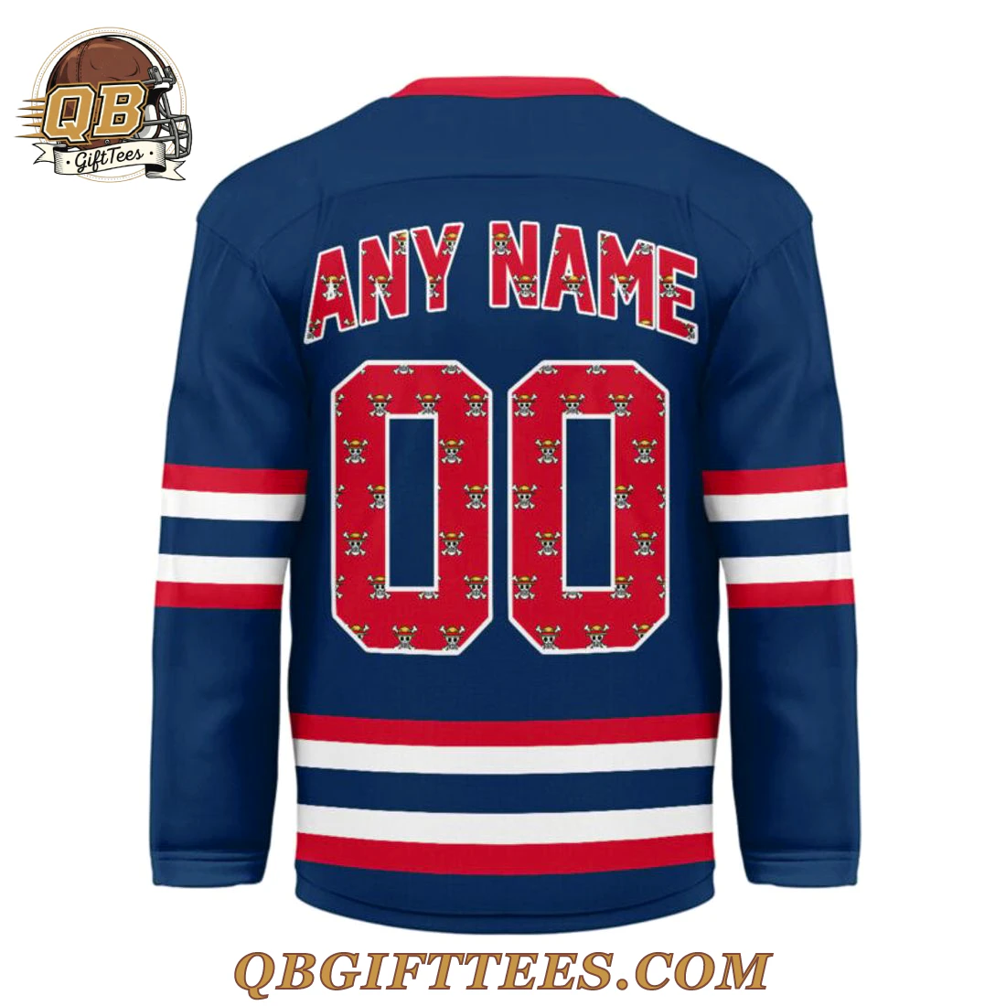 This Columbus Blue Jackets x One Piece Hockey Jersey celebrates the spirited connection between hockey fandom and the adventurous world of One Piece. Designed for fans who champion both the ice and the Grand Line, this jersey offers a unique way to express dual passions. The navy blue base color dominates, featuring a classic red V-neck collar accented by the authentic NHL shield logo. On the front, a prominent Columbus Blue Jackets primary logo sits alongside the beloved Monkey D. Luffy peeking out from below bold “COLUMBUS BLUE JACKETS” text in white and red. The long sleeves and lower torso are detailed with triple horizontal stripes in white, red, and white. The reverse side allows for personalization with “ANY NAME” and the number “00” in red text with a white outline, strikingly patterned with miniature One Piece Jolly Roger skull emblems. Crafted from 100% polyester performance knit fabric, this jersey offers a durable and breathable athletic fit designed for comfort, consistent with typical hockey jersey construction at an approximate weight of 220 GSM.