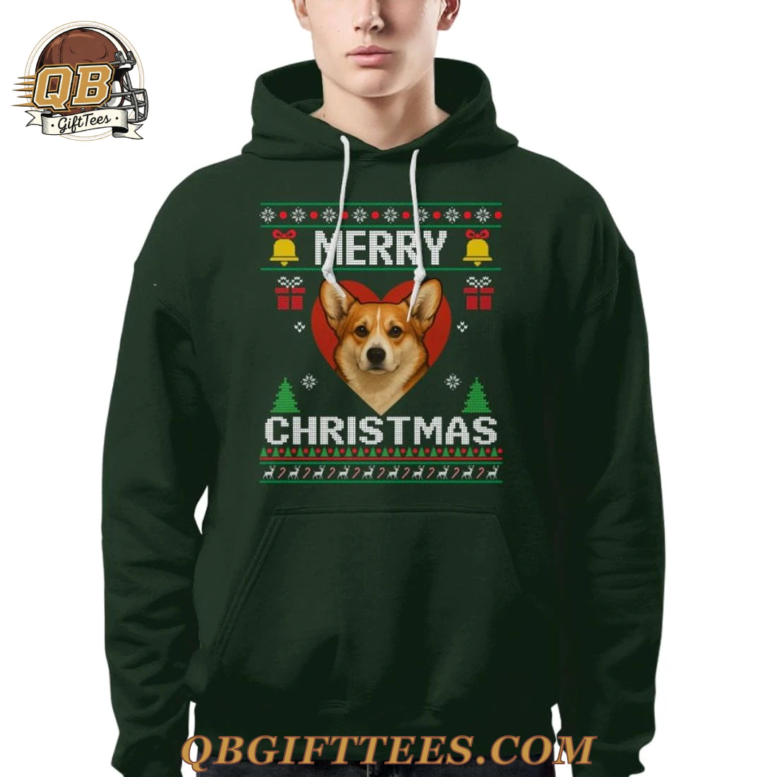 For fans who cherish the festive spirit and the undeniable charm of Corgis, the Corgi Merry Christmas Limited Edition Hoodie captures this joy perfectly. This cozy garment features a prominent front graphic, intricately designed in the style of a classic “ugly Christmas sweater.” At its heart is a delightful Corgi illustration, centered within a vibrant red heart, its expressive face looking out. Above, the words “MERRY” appear in white, flanked by festive red bells and green gift boxes, all against a background of white snowflakes and asterisks. Below the Corgi, “CHRISTMAS” is spelled out in white, followed by a border of alternating green Christmas trees and red reindeer motifs. The hoodie itself is a rich dark green, offering a comfortable and familiar silhouette. It includes a white drawstring for the hood and a spacious kangaroo pocket on the front. Crafted from a high-quality cotton-polyester blend fleece, it features a soft, brushed interior for warmth and comfort. The material provides a comfortable medium weight, typically around 8 oz/270 gsm, and the print technique ensures a durable finish that integrates well with the fabric.