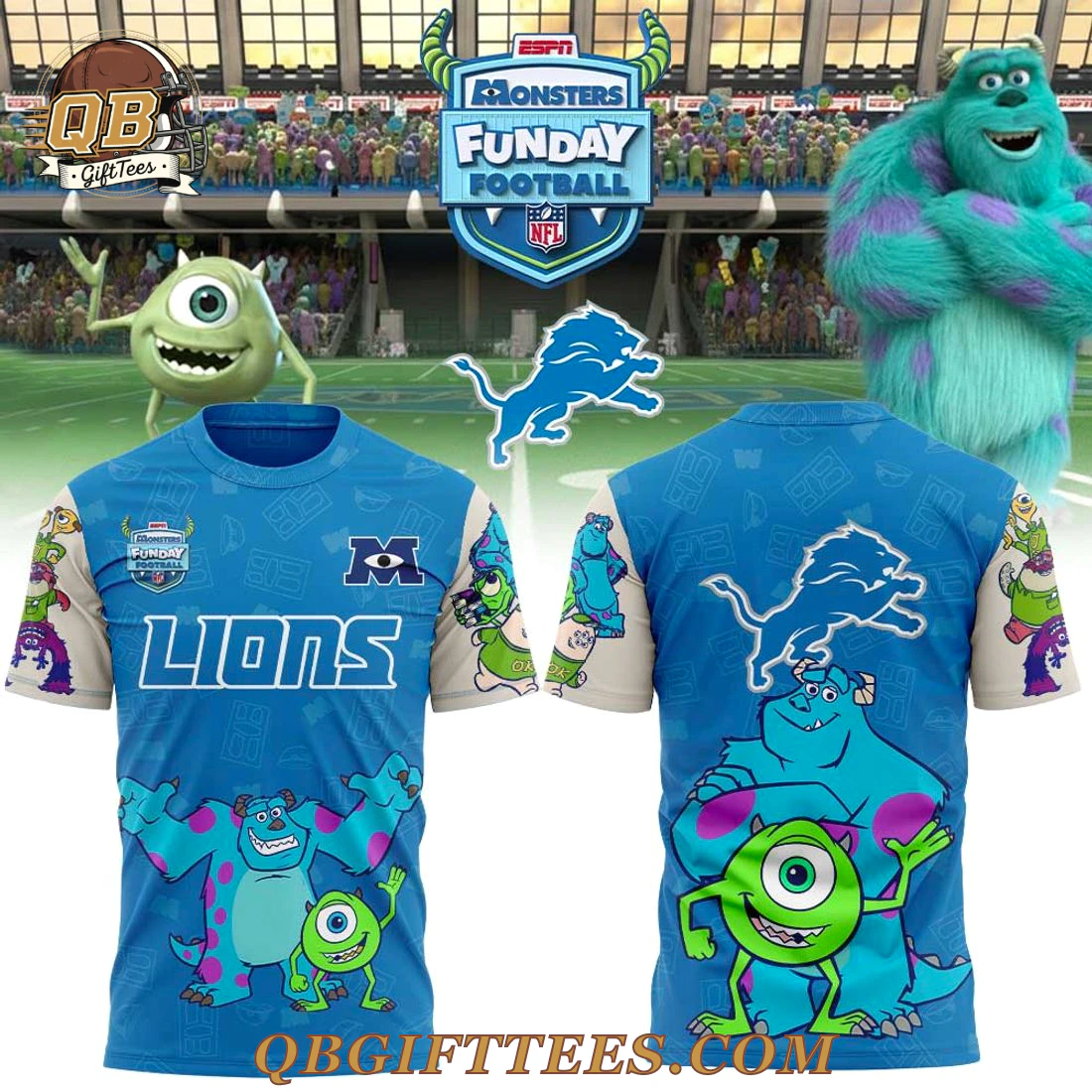Celebrate your passion for the Detroit Lions and the fun of Monsters Funday Football with this unique special edition hoodie, perfect for fans of all ages who appreciate team spirit with a playful twist. The Detroit Lions x Monsters Funday Football Special Edition Hoodie features a vibrant blue body with contrasting cream sleeves and hood lining. The front proudly displays the ESPN Monsters Funday Football logo, an “M” emblem representing Monsters Inc., and “LIONS” text in bold white across the chest. The sleeves are adorned with a lively all-over print of beloved Monsters Inc. characters like Mike Wazowski and James P. Sullivan, alongside other iconic figures from Monstropolis. The back continues the blue and cream theme, showcasing a large graphic of Sulley and Mike Wazowski, crowned by the classic Detroit Lions leaping logo. Crafted from a premium, durable polyester blend fabric, this hoodie is designed for exceptional color vibrancy and longevity. It features a soft, brushed fleece interior lining for comfortable wear, ideal for game day or casual outings.