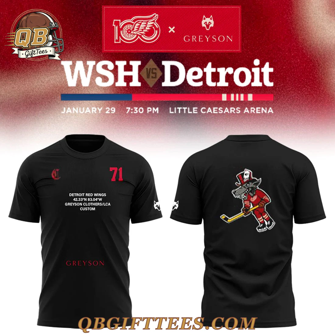 The Detroit Red Wings x Greyson Hoodie provides a modern expression of fan devotion, blending contemporary aesthetics with the enduring spirit of Detroit hockey. This black pullover hoodie showcases a minimalist yet detailed front, featuring a small red ‘C’ emblem on the left chest and the number ‘71′ in red on the right. Below, crisp white text reads “DETROIT RED WINGS”, followed by the geographical coordinates “42.33°N 83.04°W”, and “GREYSON CLOTHERS/LCA CUSTOM”. The distinctive “GREYSON” logo appears in red near the lower hem. The reverse of the Detroit Red Wings x Greyson Hoodie displays a striking, custom graphic of a stylized wolf mascot, dressed in a red Red Wings jersey and holding a hockey stick. While precise fabric specifications are not visible, it is crafted from a soft, mid-weight fleece blend, offering a comfortable feel and versatile wear typical of premium hoodies.