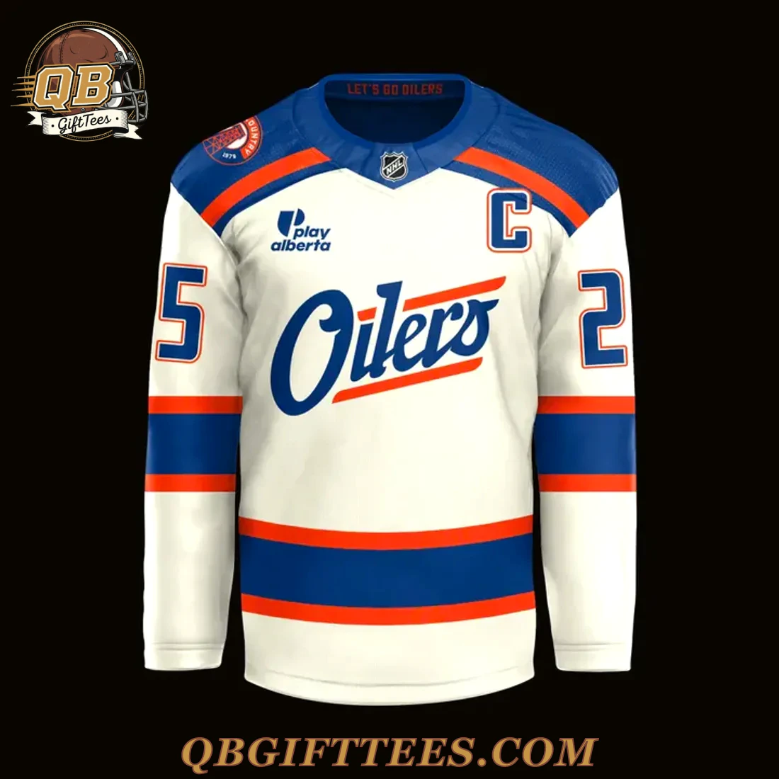 The Edmonton Oilers Darnell Nurse 25 Special Edition Hockey Jersey offers fans a tangible connection to the unwavering spirit and dedication of the Oilers and one of their most impactful players. This special edition jersey features a distinctive cream-colored base, accented with vibrant royal blue and orange stripes across the body, sleeves, and collar. On the front, the classic “Oilers” script logo is prominently displayed in blue with an orange outline. The right chest proudly bears the “C” alternate captain patch, signifying Nurse’s leadership on the ice. The left shoulder features a special “1979” patch, commemorating the team’s inaugural NHL season. An official NHL shield logo is positioned at the neck. The back of the jersey showcases “NURSE” above his iconic number “25”, both in blue with orange outlines. Crafted from a durable 100% polyester knit fabric*, this jersey offers a comfortable, breathable feel suitable for various fan activities. It features an athletic cut, typical of performance hockey apparel, designed for optimal movement and display.