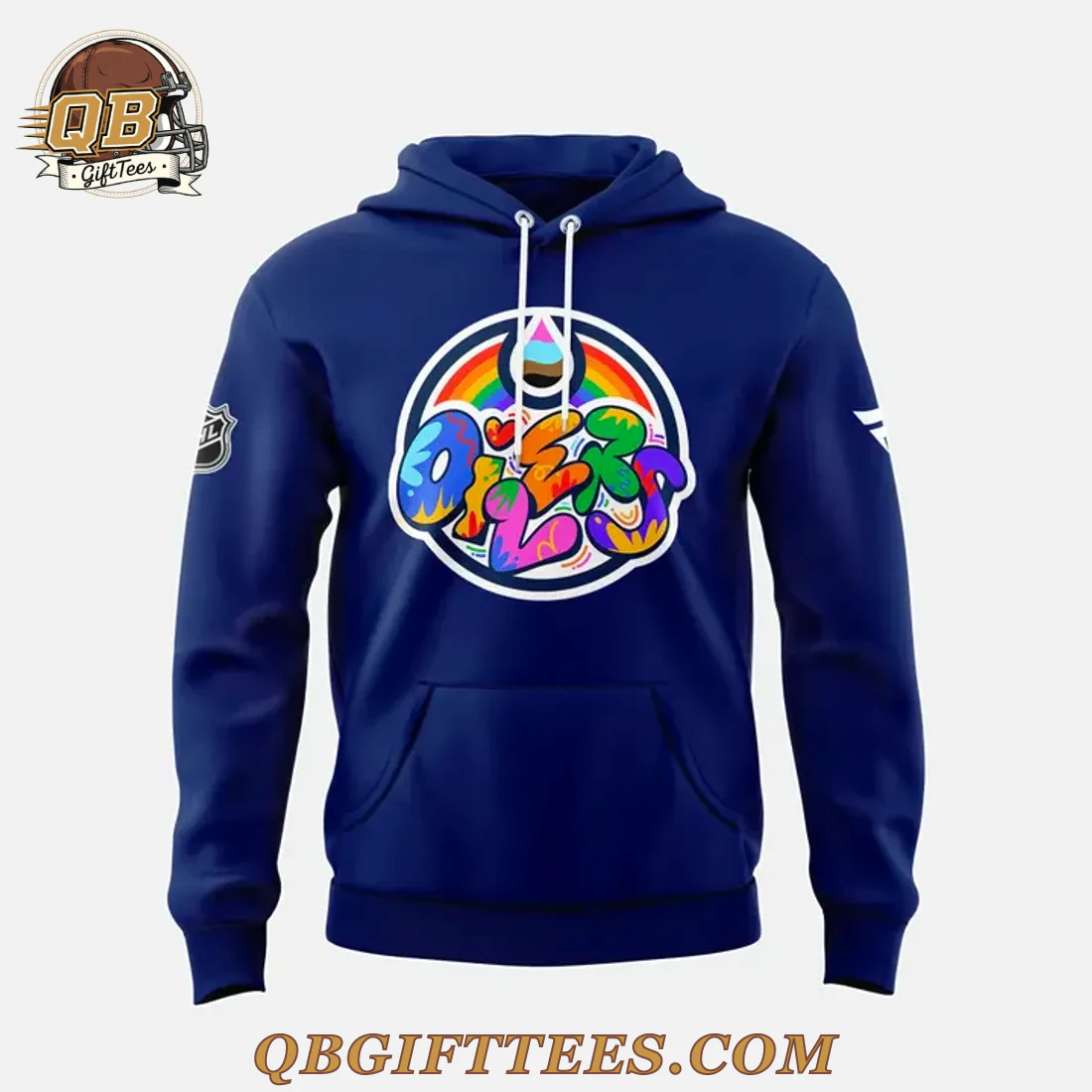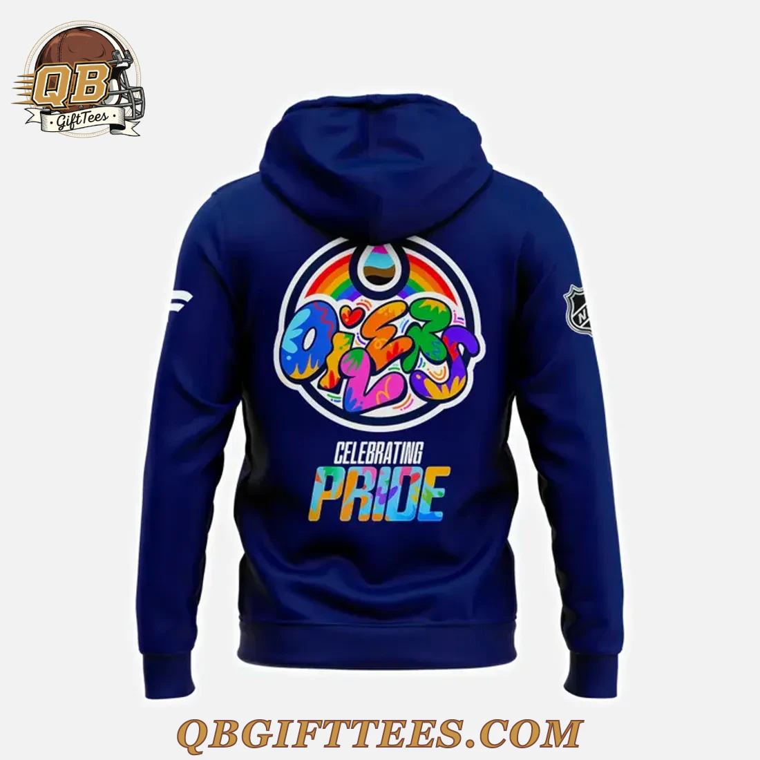 For Edmonton Oilers fans who celebrate team spirit and inclusivity, the Edmonton Oilers Navy Team Pride Logo Limited Edition Hoodie is a vibrant expression of support. This navy blue pullover hoodie features a central circular graphic on the front, bordered in white. Inside, the word “OILERS” is rendered in bold, colorful bubble letters with a rainbow gradient, accented by small hearts and a rainbow drop symbol above. The back of the hoodie mirrors this main circular graphic, complemented by ‘CELEBRATING PRIDE’ in a matching rainbow gradient font below. Official branding includes the NHL shield logo on the left sleeve and a white stylized logo on the right sleeve. Designed for comfort, this hoodie is crafted from a comfortable cotton-polyester blend fleece, offering a soft interior lining and durable fabric construction. The vibrant, fade-resistant print ensures your team pride stands out. Exact fabric blend percentages and garment weight are not specified, but it presents as a comfortable mid-weight fleece.
