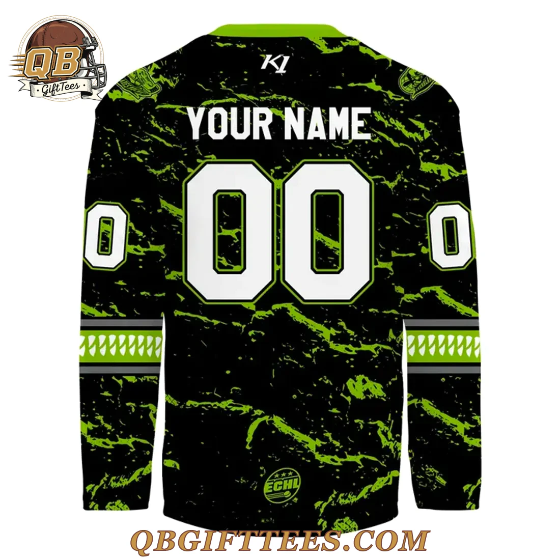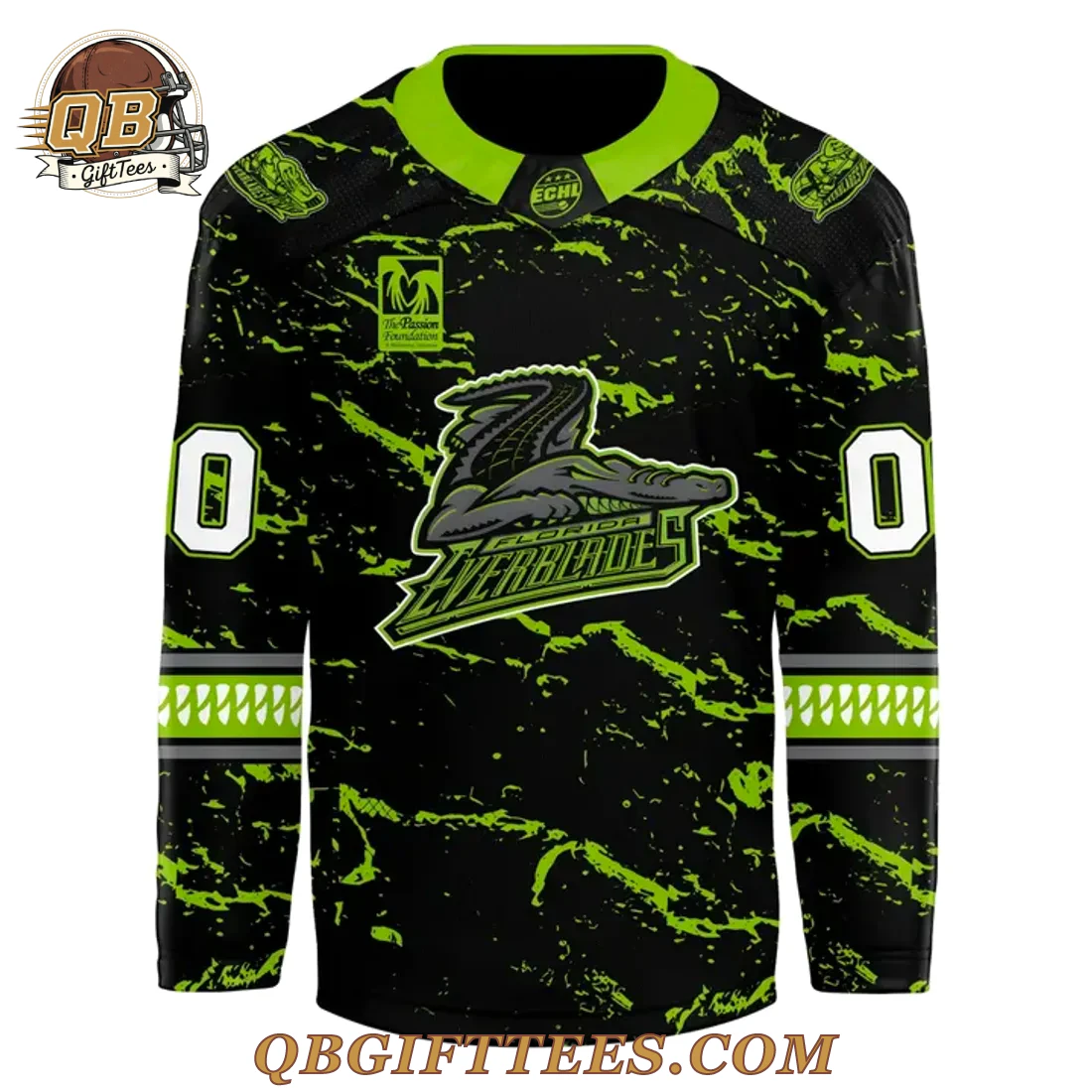 The Florida Everblades Blackout Night Edition Custom Name Hockey Jersey embodies the spirit and passion of Everblades hockey, connecting fans across all demographics to the excitement of game night. This striking jersey features a dynamic black base with a vibrant, distressed lime green splatter pattern throughout. The front prominently displays the iconic Florida Everblades alligator logo, rendered in grey and black with a bold lime green outline, centered above the team name in matching green text. The shoulders bear the official ECHL logo and what appears to be a special event or sponsor mark, “The 45th Parallel.” Sleeves are adorned with a crisp white ‘0’ number, outlined in lime green and black, complemented by a distinctive grey and lime green striping pattern incorporating a serrated white design near the cuffs. Crafted from a durable, performance-grade polyester mesh fabric*, this jersey is designed for breathability and comfort, allowing fans to wear their team pride without compromise.