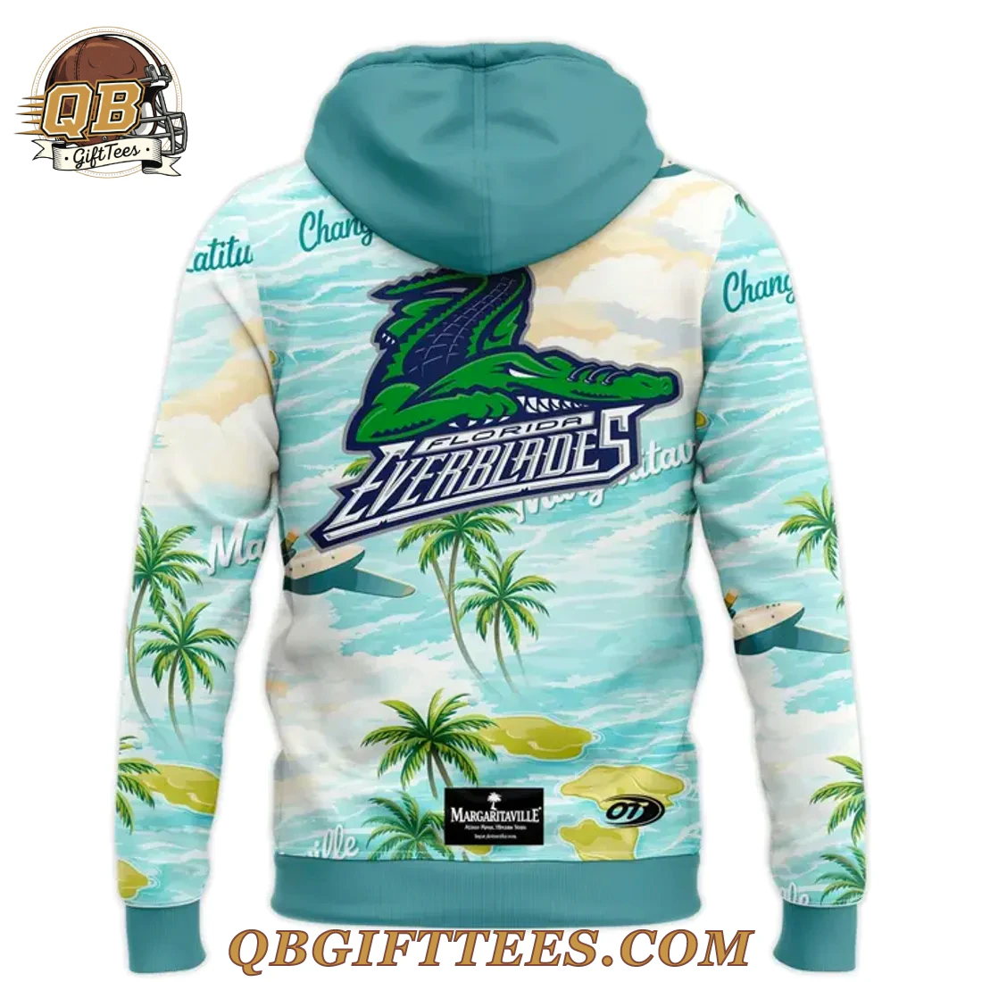 Embrace the spirit of fan camaraderie and tropical relaxation with the Florida Everblades Margaritaville Night Hoodie, a vibrant tribute to two beloved institutions. This pullover hoodie showcases an all-over sublimated print featuring a serene, light blue ocean scene with gentle waves. Lush green palm trees stand on sandy islands, while small seaplanes glide across the water under a sky dotted with fluffy clouds and faint “Changes in Latitudes” text. The iconic Florida Everblades logo, a fierce green alligator over “Florida Everblades” in blue and white, is prominently displayed on both the front and back of the garment. Additional “Margaritaville” script subtly weaves through the design. The hoodie features a comfortable front kangaroo pocket and a drawstring hood with a contrasting turquoise lining and matching drawstrings, complemented by turquoise ribbed cuffs and hem. Crafted from a premium, lightweight 100% polyester fabric, this hoodie offers a smooth finish and a relaxed fit, ideal for fan comfort.