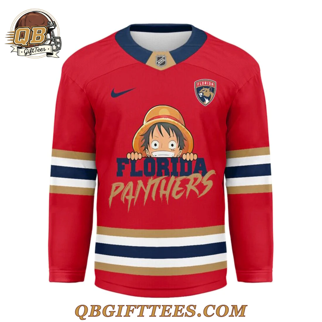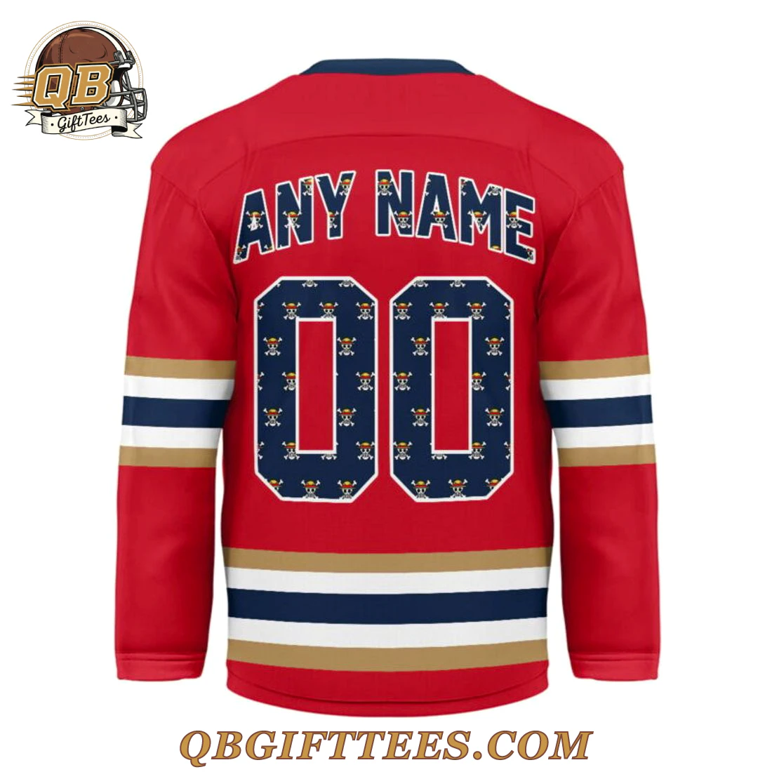 Uniting the fierce spirit of hockey with the boundless adventure of the Grand Line, the Florida Panthers x One Piece Hockey Jersey is a distinctive tribute for fans of both franchises. This red jersey prominently features Monkey D. Luffy, depicted in his iconic straw hat, peeking from behind the stylized “FLORIDA PANTHERS” text rendered in a bold gold and navy font across the chest. The design includes an official Florida Panthers shoulder patch on the right, an NHL shield at the collar, and a swoosh on the left chest. Horizontal stripes in white, navy, and gold adorn the sleeves and lower body. The back of the jersey showcases “ANY NAME” in navy above large numbers “00,” with both elements patterned internally by repeating Straw Hat Pirates Jolly Roger emblems. It is constructed from durable, 100% polyester sports mesh fabric, weighing approximately 250 GSM, ensuring breathability and comfort.