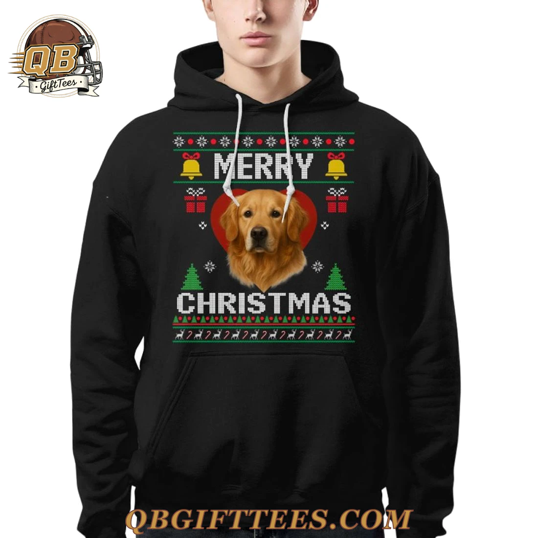 For fans who cherish the heartwarming spirit of Golden Retrievers and the joyous warmth of the holiday season, the Golden Retriever Christmas Classic Limited Edition Hoodie offers a delightful way to celebrate. This black pullover hoodie features a vibrant, “ugly sweater” style graphic prominently displayed on the front. At its center is a detailed, lifelike headshot of a Golden Retriever, framed within a bright red heart. Above the portrait, the phrase ‘MERRY CHRISTMAS’ is spelled out in festive red, green, and white block lettering, accented with golden jingle bells and snowflakes. Below the Golden Retriever, a pattern of green Christmas trees and a charming border of stylized reindeer complete the festive motif. The back of the hoodie is solid black. Crafted from a comfortable, mid-weight cotton-polyester blend, this hoodie provides a soft feel against the skin and a durable construction. The festive graphic features high-resolution digital printing, ensuring vibrant colors and crisp details that are designed for lasting appeal*.