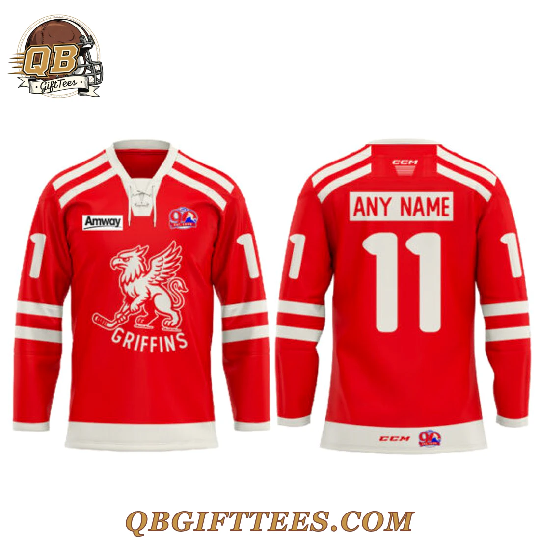 The Grand Rapids Griffins 90th Vintage Vibe Edition Custom Name Hockey Jersey offers a tangible connection to the enduring legacy of hockey, appealing to both seasoned enthusiasts and modern supporters of the Griffins. This striking jersey is presented in a vibrant red primary color, complemented by crisp white and red striped patterns on the sleeves and a clean white band along the lower hem. Its classic design includes a white lace-up collar, enhancing its vintage aesthetic. The front prominently features the iconic white Griffins mascot, depicted wielding a hockey stick, accompanied by “GRIFFINS” text. An “Amway” sponsor logo is located on the upper left chest, alongside a commemorative “90th Est. 1936” patch on the upper right. White number “1” graphics are visible on both shoulders. The back allows for full customization with “ANY NAME” positioned above a bold white “11,” accented by a discreet CCM logo and a matching “90th Est. 1936” patch near the lower hem. This jersey is crafted from a performance-grade, mid-weight polyester fabric, engineered for comfort and resilience, providing the look and feel of an authentic fan replica.