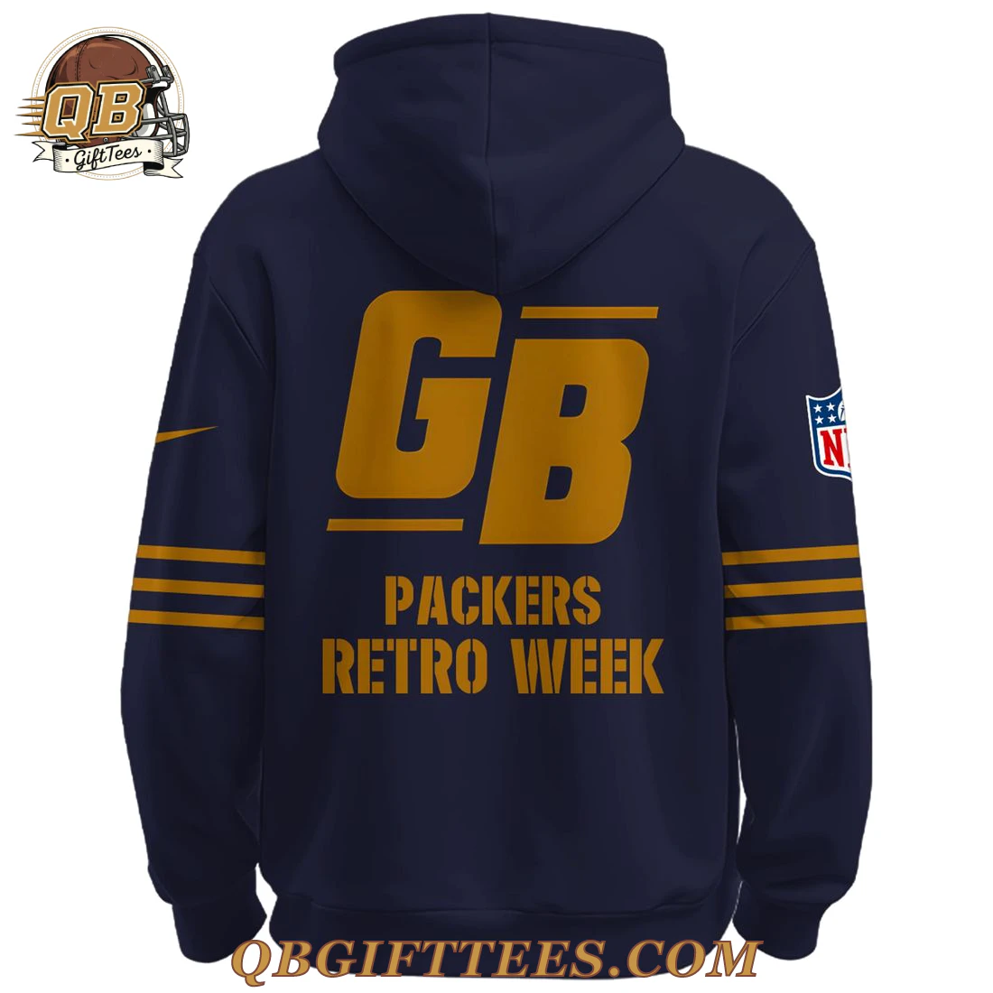 For Green Bay Packers fans, the Green Bay Packers Retro Week Hoodie offers a tangible connection to the team’s storied past and enduring legacy. It celebrates decades of championship football and the unwavering spirit of the Lambeau faithful. This hoodie features a deep navy blue base, adorned on the front with “PACKERS” in a classic gold typeface positioned above the iconic gold-outlined “G” logo. Gold stripes encircle both sleeves, while the NFL shield logo graces the left sleeve and the swoosh the right. A practical front pouch pocket and an adjustable drawstring hood are integrated. The reverse side prominently displays a bold, underscored “GB” in gold, with “PACKERS RETRO WEEK” inscribed beneath in matching gold text, emphasizing the vintage theme. Another NFL shield logo is present on the upper right back. Constructed from a soft, durable 80% cotton / 20% polyester fleece blend, this hoodie provides a comfortable mid-weight feel, typically around 8.0 oz/yd² (271 g/m²), ensuring warmth and comfort.