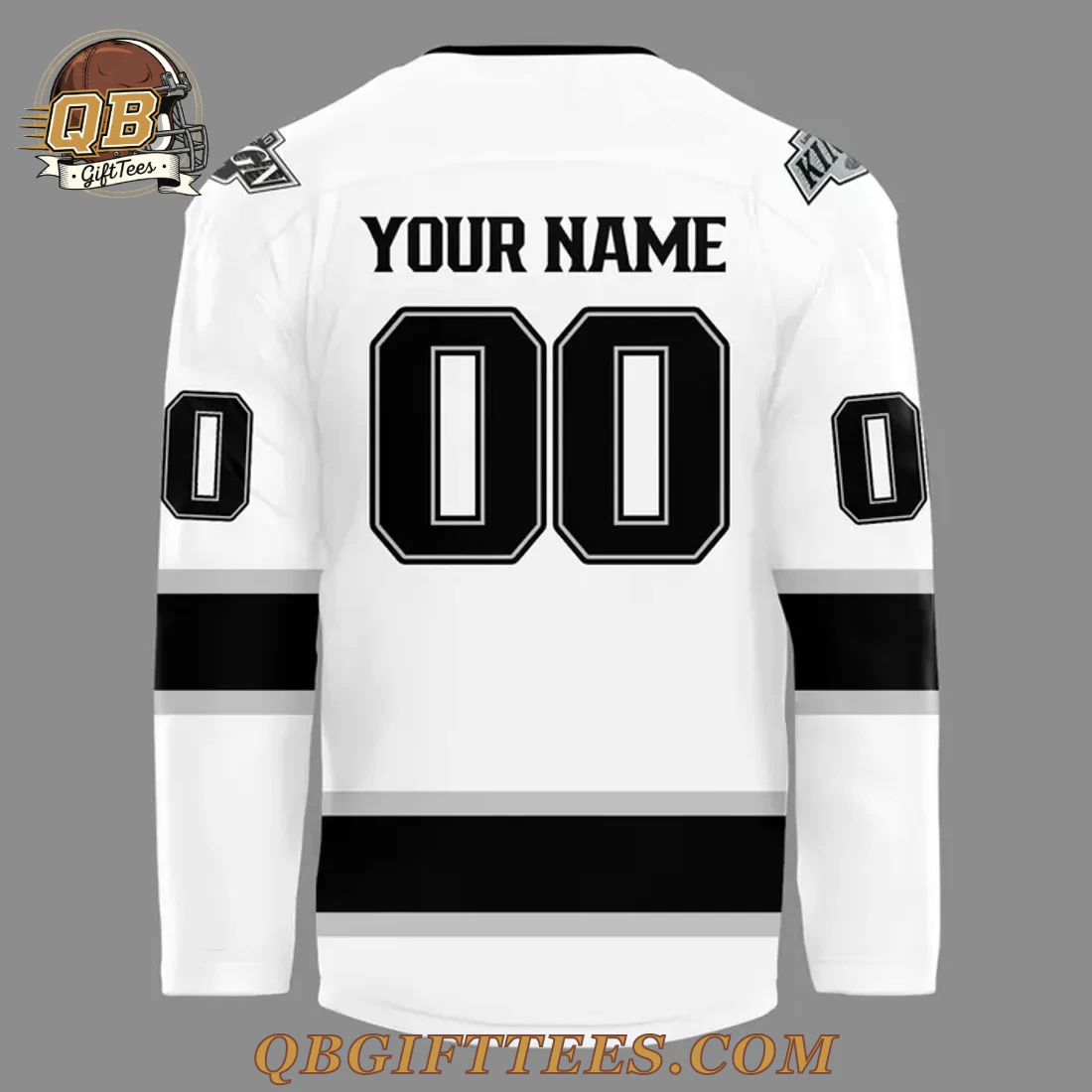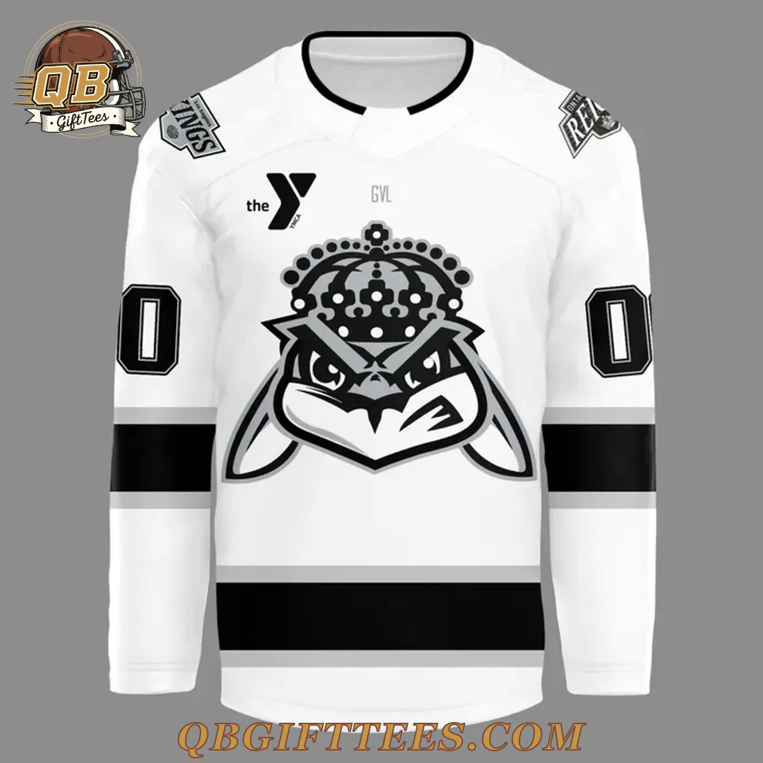For loyal fans of the Greenville Swamp Rabbits, the Greenville Swamp Rabbits 2025 Limited Edition Hockey Jersey represents a fresh era of team spirit and dedication. This striking white jersey features the bold new ‘White Rabbit King’ emblem prominently centered on the chest, a fierce rabbit mascot crowned in intricate grey and black detail. Complementing the primary design, the jersey incorporates classic black and grey horizontal stripes across the lower hem and sleeves, providing a sleek contrast. Team-affiliated logos, including ‘the YMCA’ and ‘GVL’, are visible on the upper chest. Each shoulder features a distinct emblem, with ‘KINGS’ on the left and ‘REBELS’ on the right, adding to the unique design. The v-neck collar is trimmed in black, and the sleeves display black ’00’ numbers. The reverse side features customizable ‘YOUR NAME’ text above a large, black ’00’ number, framed by the continued stripe pattern on the sleeves and hem. Crafted from high-performance, moisture-wicking 100% polyester fabric, this jersey offers both durability and breathability. Weighing approximately 270 GSM (Grams per Square Meter), it’s designed for an athletic fit, providing comfort for various body types. The fabric’s construction ensures vibrant color retention and resistance to wear over time.