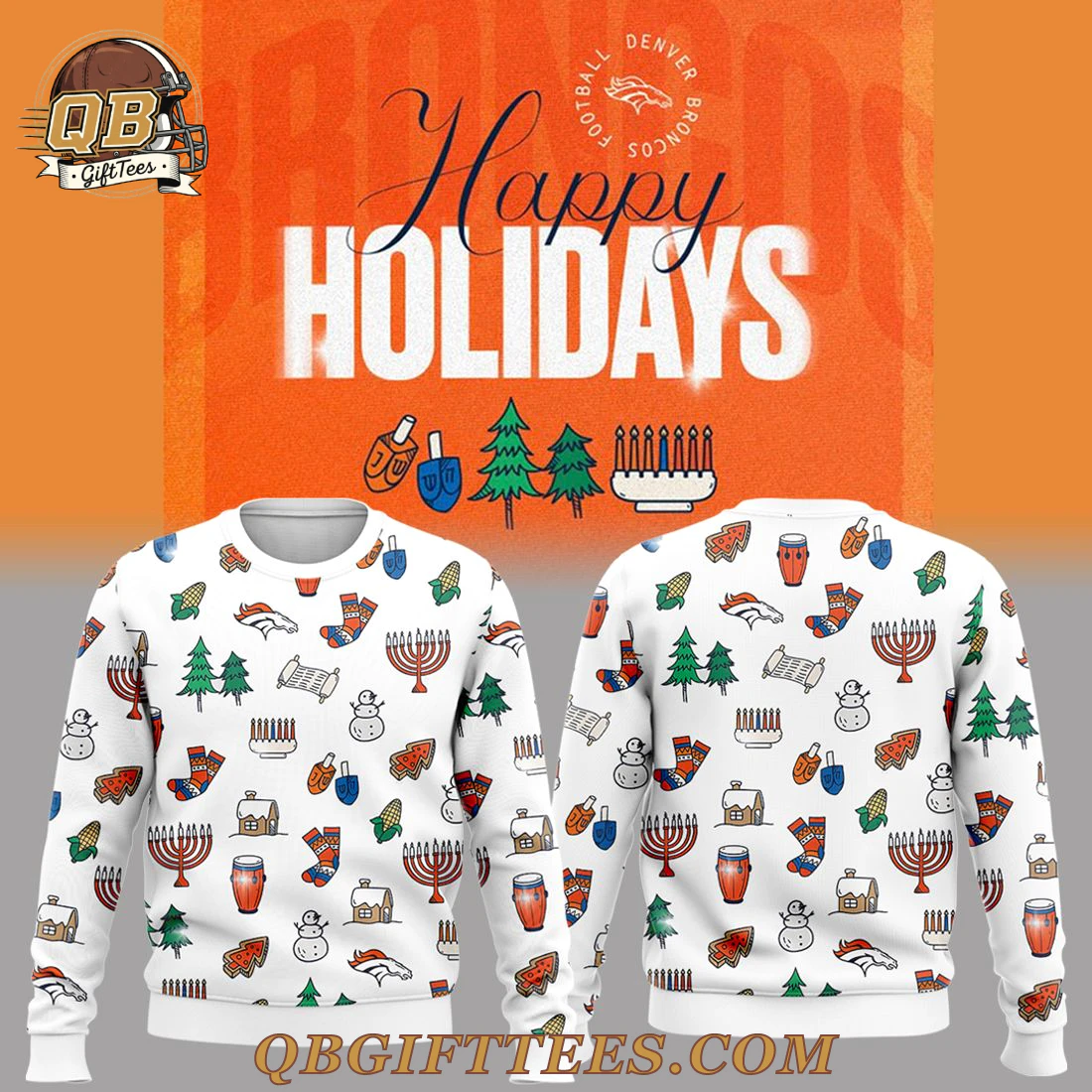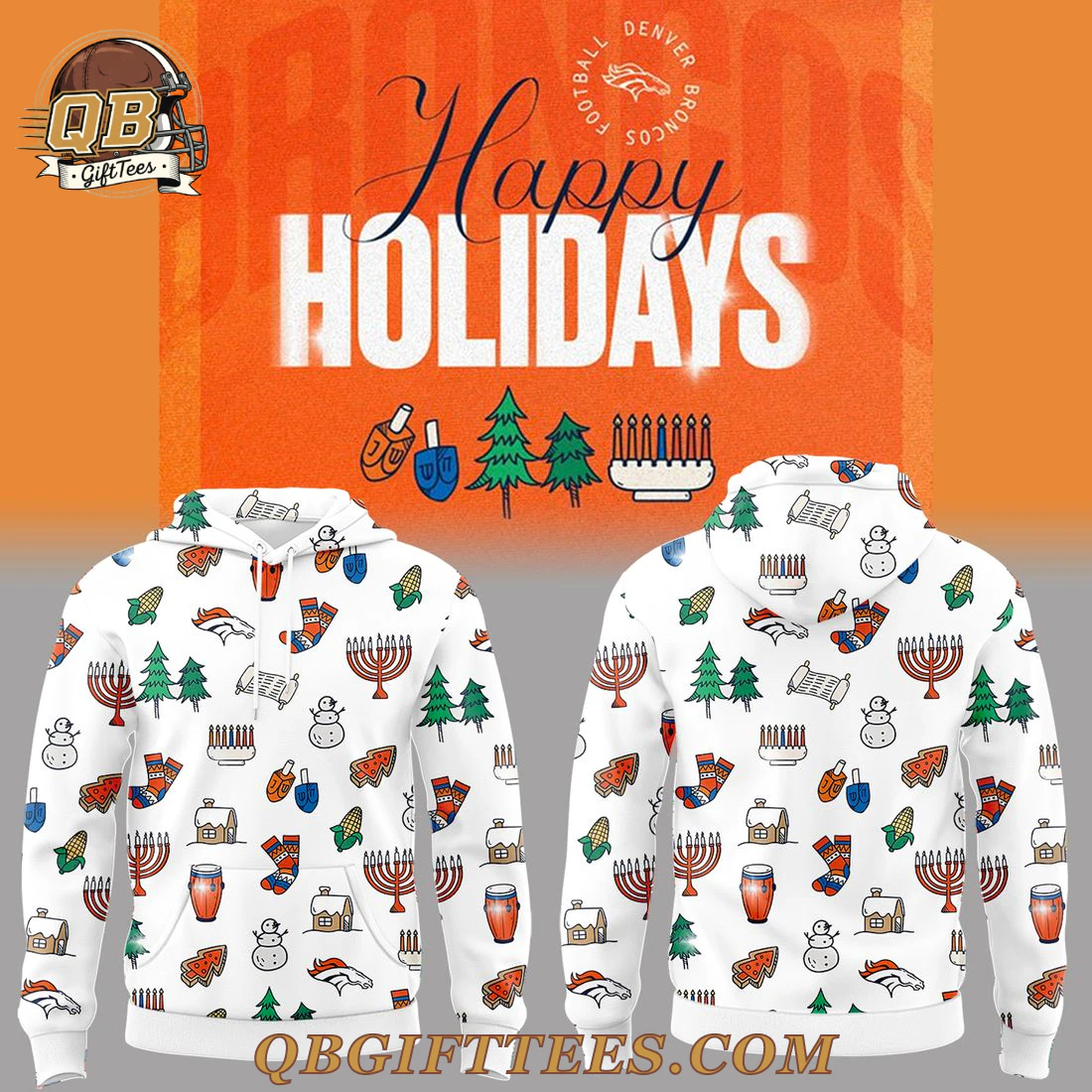 The Happy Holidays Edition Hoodie connects Denver Broncos fans across all demographics with the festive spirit of the season and their beloved team. This white, all-over print hoodie features a delightful pattern of various holiday icons interspersed with the iconic Denver Broncos horsehead logo. Visible design elements include festive green Christmas trees, cheerful snowmen, wrapped gifts, red and white striped stockings, gingerbread houses, cornucopias, dreidels, and menorahs, all arranged in a continuous, repeating pattern on both the front and back of the garment. Crafted from a comfortable 85% Polyester, 15% Cotton blend, this hoodie offers a soft feel with a vibrant, fade-resistant print. It features a medium-weight fabric of approximately 280-300 GSM (grams per square meter), ensuring a cozy fit suitable for cooler temperatures. Available in a standard range of adult sizes from Small to 3XL, the design consistently extends across all panels, including the hood and sleeves.