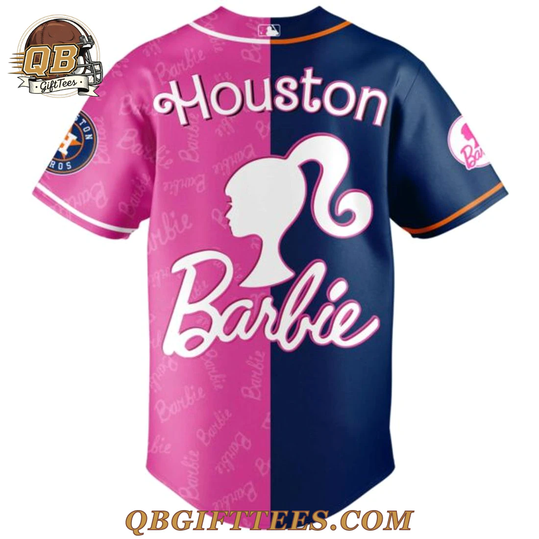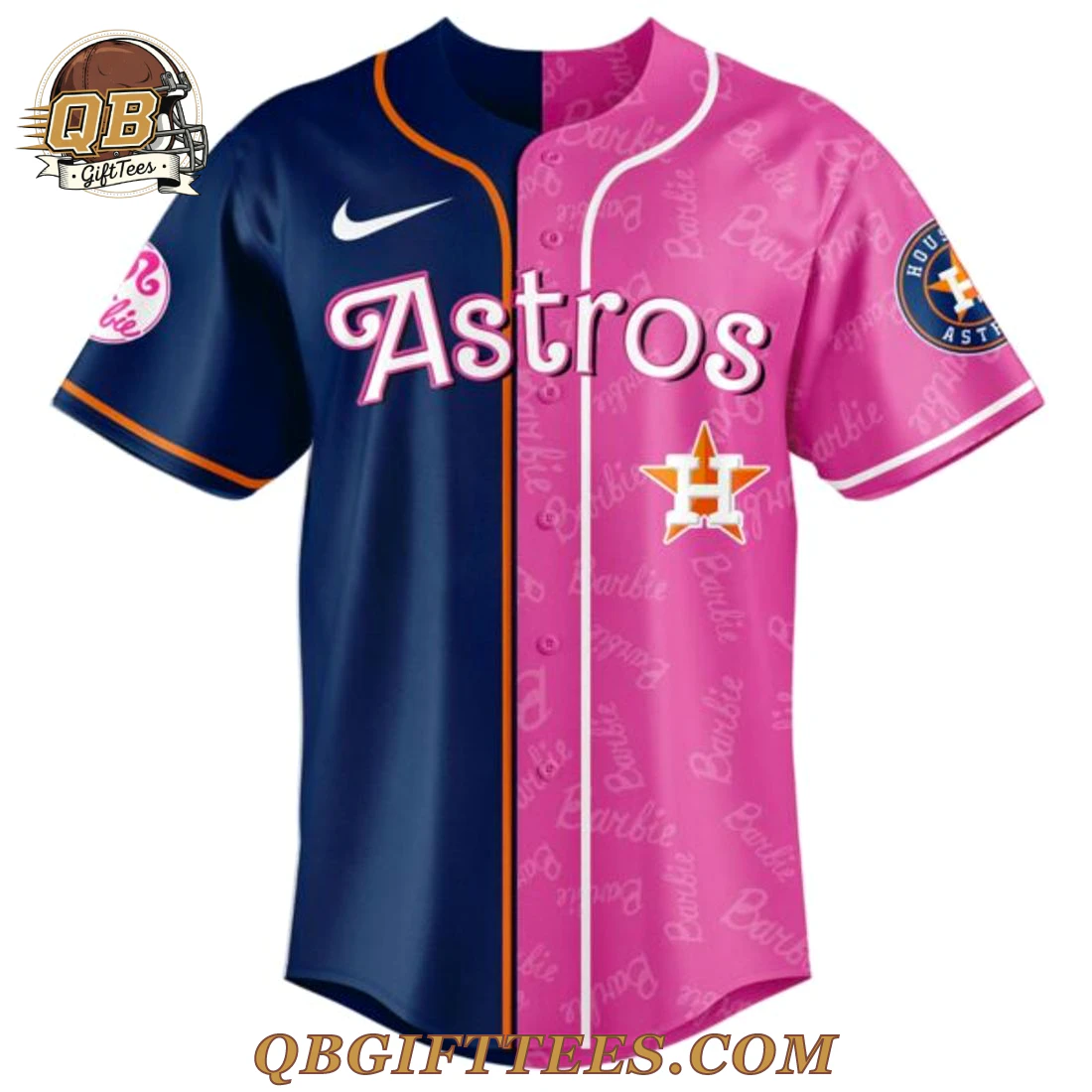 The Houston Astros x Barbie Night Game 2026 Baseball Jersey offers a unique blend of team loyalty and pop culture appeal, perfect for fans celebrating both Houston baseball and the iconic Barbie aesthetic. This eye-catching full-button baseball jersey features a distinct split design, with the wearer’s left side in classic navy blue and the right side in vibrant Barbie pink. Across the chest, “Astros” is emblazoned in a stylized script, white on the navy side transitioning to pink on the Barbie pink side. The Barbie pink half also features a white star with an orange “H,” a nod to the team’s primary logo, alongside subtle repeating “Barbie” script throughout the fabric. A white swoosh adorns the left chest, while the left sleeve displays the official Astros team patch and the right sleeve features a special pink Barbie patch. The jersey is crafted from lightweight, breathable 100% polyester fabric, designed for comfort and durability during warm game days. A clean white piping accents the button placket, and both sleeves are finished with a thin orange trim. The back mirrors the split design, with the right side navy and the left side pink, showcasing “Houston” in stylized script above a prominent white Barbie silhouette, followed by “Barbie” in script, all against the repeating “Barbie” pattern on the pink portion.