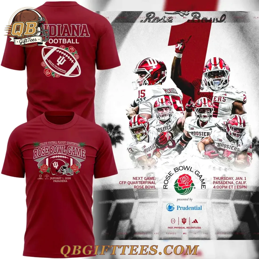 For dedicated Indiana Hoosiers fans, the Indiana Hoosiers Rose Bowl 2026 Edition Hoodie represents the excitement and hopeful anticipation of a significant moment in collegiate football. This hoodie features a rich crimson red base, reflecting the iconic team colors. The front design proudly displays “COLLEGE FOOTBALL PLAYOFF QUARTERFINAL” above “ROSE BOWL GAME” in an arched format. Below this, a detailed graphic combines a football helmet, a football with “INDIANA HOOSIERS” lettering, and classic rose accents, accompanied by “JANUARY 1, 2026 PASADENA.” The reverse side of the hoodie prominently features “INDIANA” and “FOOTBALL” in bold lettering, centered above a large football graphic intertwined with Hoosiers text and subtle rose embellishments. All graphical elements on both sides are rendered in contrasting white and light grey tones, ensuring high visibility against the deep red fabric. The hoodie is designed with a classic pullover style, including a drawstring hood, a spacious front kangaroo pocket, and ribbed cuffs and hem, characteristic of a comfortable, mid-weight garment.