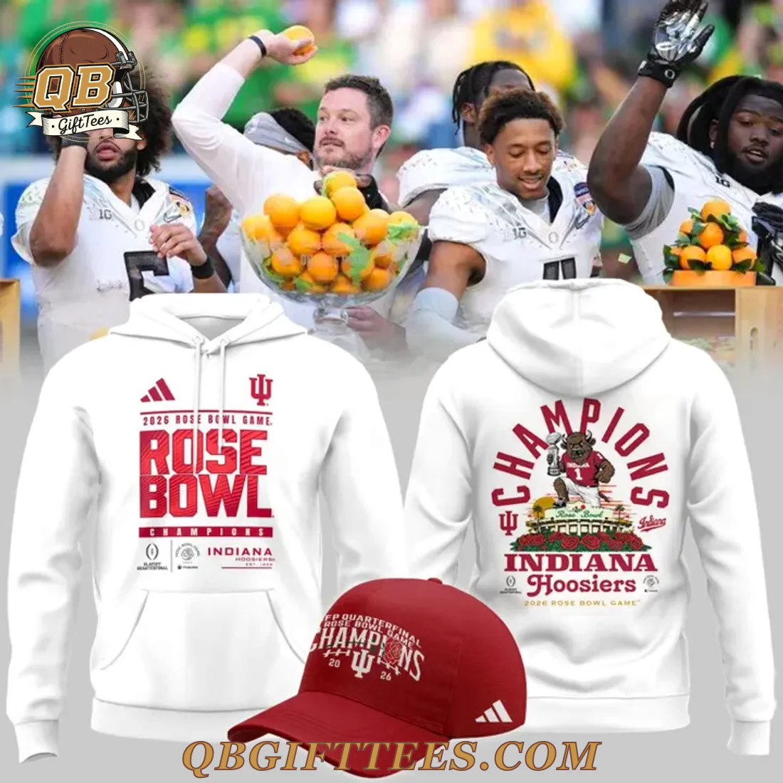 The Indiana Hoosiers Rose Bowl Game Champions Edition For Fan Hoodie captures the excitement of a hypothetical future triumph, representing the enduring spirit and hopeful anticipation of Hoosier fans. This white hooded sweatshirt features bold, screen-printed graphics in vibrant red. The front proudly displays “2026 ROSE BOWL GAME” above a prominent “ROSE BOWL” text, intersected by “CHAMPIONS.” Below, “INDIANA HOOSIERS” is printed, accompanied by the IU trident logo and official College Football Playoff and Rose Bowl emblems. The reverse side showcases an arched “CHAMPIONS” graphic over a detailed illustration of the IU mascot celebrating on a float, set against a stadium backdrop. “INDIANA HOOSIERS” and “2026 ROSE BOWL GAME” complete the back design, alongside the IU trident and a script “Indiana.” Crafted from a comfortable mid-weight 8.0 oz/yd² (270 gsm) cotton-polyester fleece blend, this hoodie offers a relaxed fit, designed for lasting comfort and vibrant graphic retention.