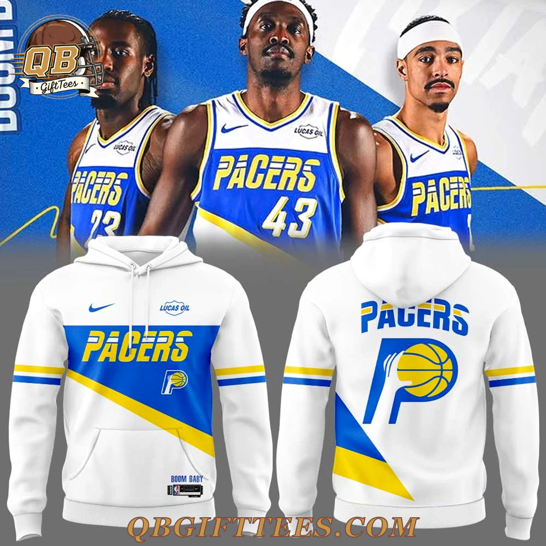 Embrace your passion for Indiana basketball with the Indiana Pacers Our 2025-26 City Special Edition T-Shirt, a design that resonates with the energy of game night and the vibrant spirit of the franchise. This special edition tee features a clean white base, dynamically bisected by a bold blue and yellow diagonal stripe design extending from the left shoulder towards the right hip on the front. Centered on the chest, “PACERS” is prominently displayed in blue lettering, accented by the team’s iconic “P” basketball logo below. A white swoosh sits on the upper left chest, complemented by the Lucas Oil sponsor logo on the upper right. The back of the shirt continues the clean white aesthetic, showcasing “PACERS” across the shoulders above a large, centered “P” basketball logo, with an NBA logo at the neckline. Crafted from a lightweight, breathable performance polyester blend, this fabric is designed for comfort and ease of movement. The T-shirt’s estimated material weight is approximately 4.5 oz/yd² (150 GSM)*, providing a comfortable, soft feel.