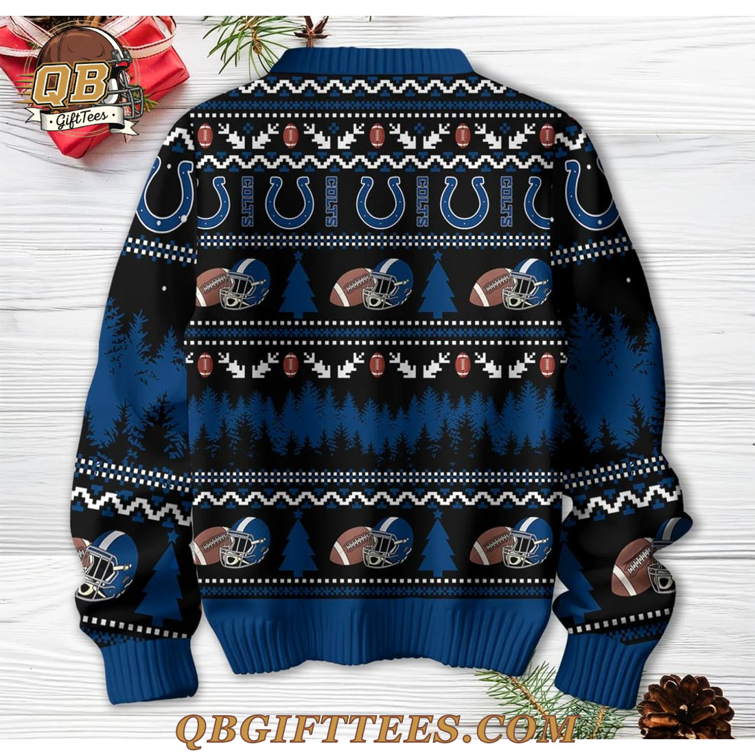 Embrace the festive spirit and showcase your unwavering loyalty to the Indianapolis Colts with the Indianapolis Colts Tis The Season Ugly Sweater. Designed for every dedicated fan, this sweater blends holiday cheer with team pride, making it perfect for celebrating the season. The front of the sweater features a bold black background adorned with a large, central blue Colts horseshoe logo, playfully topped with a red Santa hat, above “Tis the Season” in festive white script. White snowflakes dot the upper black section, while a pattern of blue forest trees silhouettes the lower portion. Below this, a strip of blue ribbed cuff features alternating blue Colts helmets, footballs, and blue Christmas trees. The upper chest displays a repeating pattern of white “COLTS” text interspersed with blue horseshoe logos and small white footballs. The back mirrors this joyful design with the blue forest silhouette, a repeating pattern of blue helmets, footballs, and trees, along with the “COLTS” and horseshoe logo border. Both front and back are bordered by blue ribbed cuffs, with the sleeves continuing the festive helmet, football, and tree motif against a black and blue forest backdrop. This knitted garment is crafted from a high-quality acrylic and polyester fiber blend, offering a comfortable medium weight ideal for colder weather. Specific garment dimensions vary by size.