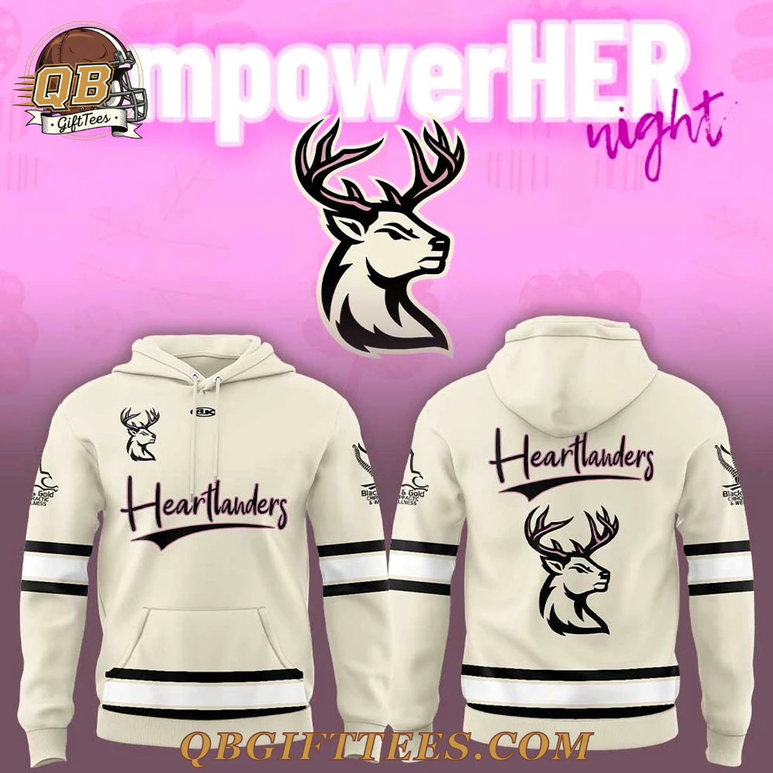 The Iowa Heartlanders EmpowerHer Limited Edition Hoodie celebrates the spirit of unity and dedication that defines Heartlanders fans. This distinctive cream-colored hoodie features the iconic Iowa Heartlanders deer logo prominently on the upper left chest, complemented by the ECHL logo on the upper right. The team name, “Heartlanders,” is displayed in an elegant dark purple script across the front. Each sleeve boasts a custom “Black & Gold Illness” patch, signifying community ties. The design includes athletic-inspired black and white striped bands on the sleeves and lower hem, giving a classic look. On the back, “Heartlanders” is scripted near the neckline above a large, striking deer logo, ensuring your team pride is visible from every angle. Crafted from a premium athletic fabric blend (commonly featuring a high cotton content for breathability and polyester for durability), this hoodie offers a comfortable, true-to-size fit and a soft fleece interior.