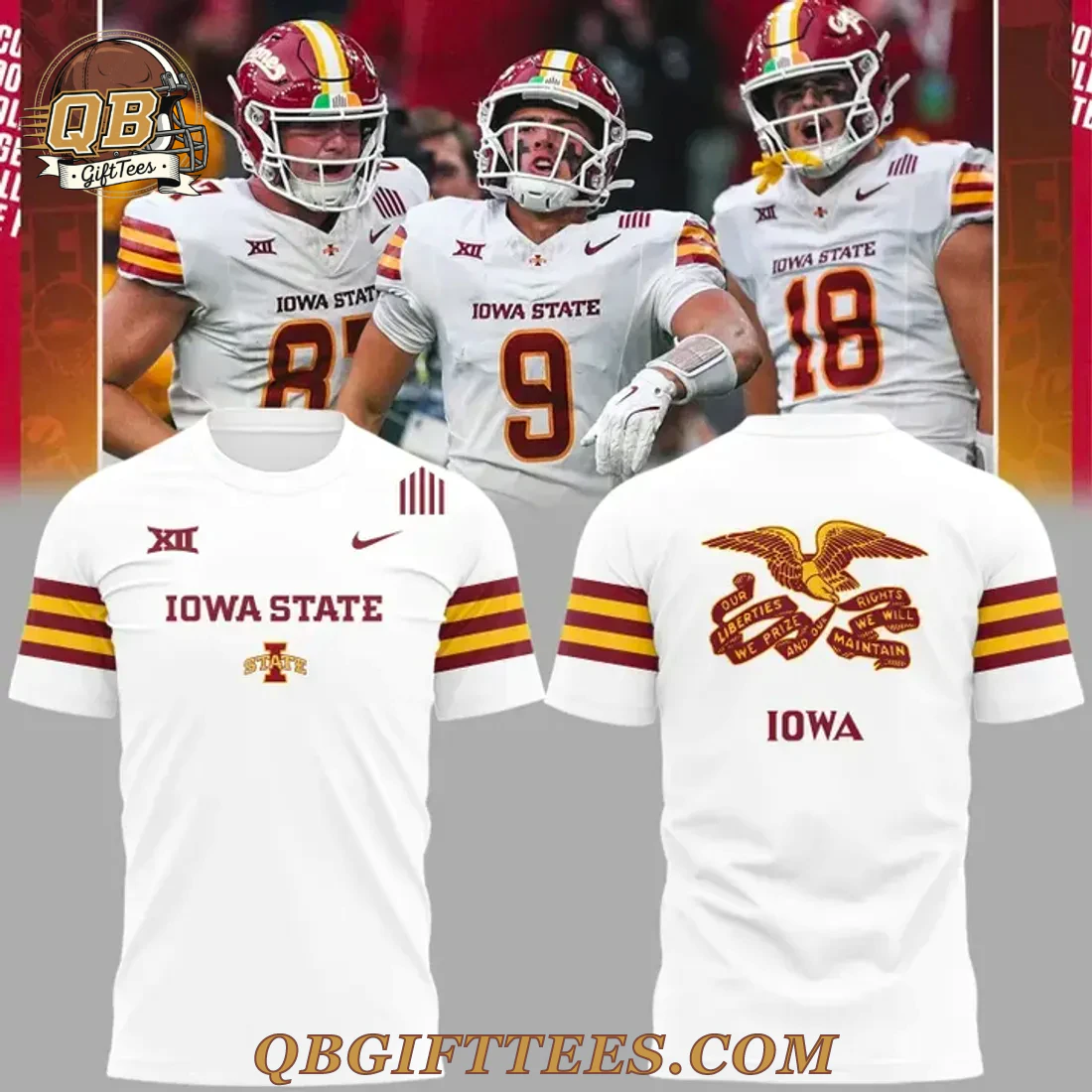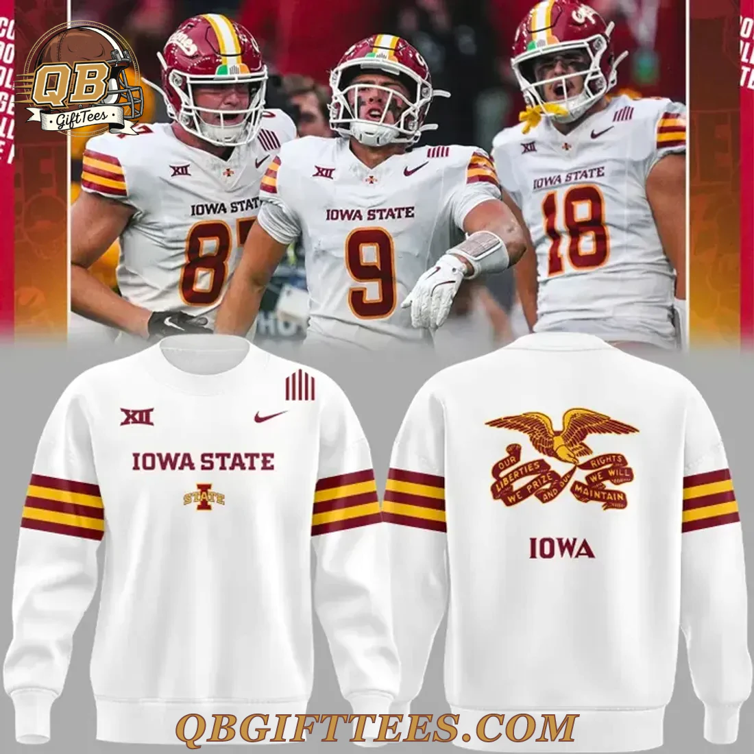 The Iowa State Cyclones Flag Limited Edition Hoodie offers fans a direct way to express their enduring pride in the Iowa State Cyclones. Designed on a crisp white base, the front proudly displays “XII” and a discreet swoosh near the collar, with “IOWA STATE” emblazoned across the chest in maroon. Below, the distinctive “I-State” logo adds an authentic touch, complemented by a functional kangaroo pocket. Both sleeves feature bold, horizontal stripes in maroon and gold, mirroring iconic team colors. The reverse of this Iowa State Cyclones Flag Limited Edition Hoodie showcases a striking golden eagle, perched above a banner unfurled with the powerful motto, “OUR LIBERTIES WE PRIZE AND OUR RIGHTS WE WILL MAINTAIN,” with “IOWA” positioned beneath. This hoodie is constructed from a comfortable and durable mid-weight fabric blend, typically 50% cotton and 50% polyester fleece, ensuring a soft interior and smooth exterior.