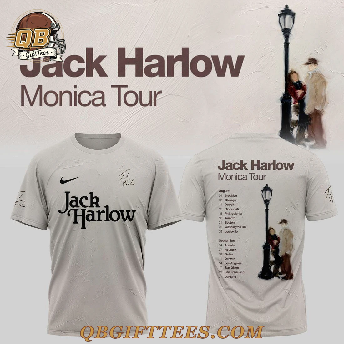 Experience a piece of Jack Harlow’s unique artistic journey with the Jack Harlow Monica Tour Special Edition Hoodie. This exclusive garment connects fans to the introspective mood and storytelling characteristic of his music. Crafted in a versatile light grey, the hoodie features a prominent black swoosh on the upper left chest, signifying quality and collaboration. Centered below, “Jack Harlow” is boldly printed in a classic black serif font. Stylized black signatures, characteristic of the artist, are subtly placed on the upper right chest and the left sleeve cuff, adding an authentic touch. The reverse proudly displays “Jack Harlow Monica Tour” at the top, followed by a comprehensive list of tour dates and cities from August and September. A central, painterly graphic depicts a nostalgic street lamp illuminating two figures, embodying the evocative themes often found in his work. Another stylized signature graces the right sleeve cuff. This hoodie is made from a comfortable and durable mid-weight fabric blend, typically 80% cotton and 20% polyester, offering a soft fleece interior and a smooth exterior finish, designed for lasting wear and comfort*.