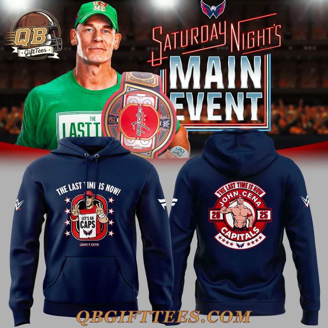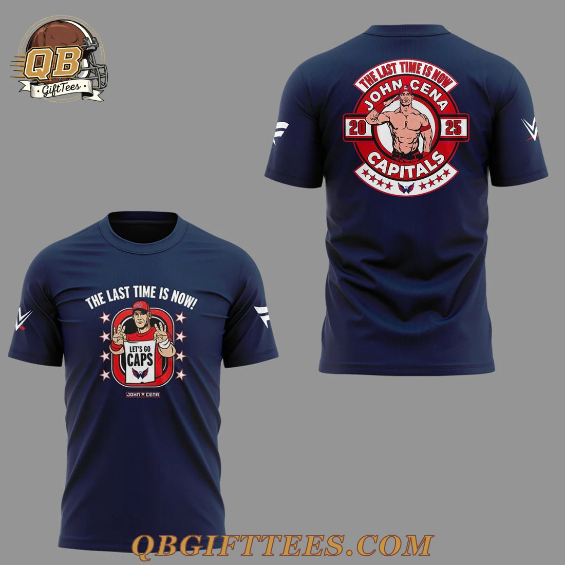 The John Cena Special Edition Shirt connects the unwavering dedication of wrestling fans with the passionate spirit of hockey supporters. This unique crossover celebrates the iconic presence of John Cena alongside the pride of the Washington Capitals. The navy blue crew-neck shirt features “THE LAST TIME IS NOW!” prominently across the chest. Below, a stylized cartoon depiction of John Cena, sporting a red “LET’S GO CAPS” hat and shirt, delivers his signature “You Can’t See Me” gesture, encircled by white stars. Subtle white WWE logos adorn both sleeves, completing the front design. Crafted from a premium 60/40 cotton-polyester blend, this John Cena Special Edition Shirt offers enhanced breathability and long-lasting wear. Weighing approximately 4.8 oz/sq yard (165 gsm), it provides a comfortable feel suitable for active fan events or casual display. The back of the shirt continues the theme with a circular graphic stating “THE LAST TIME IS NOW!” at the top, followed by “JOHN CENA” above a dynamic image of the wrestler. Below, “20” and “25” flank the Cena graphic, with “CAPITALS” prominently displayed at the bottom, framed by four red stars on each side.