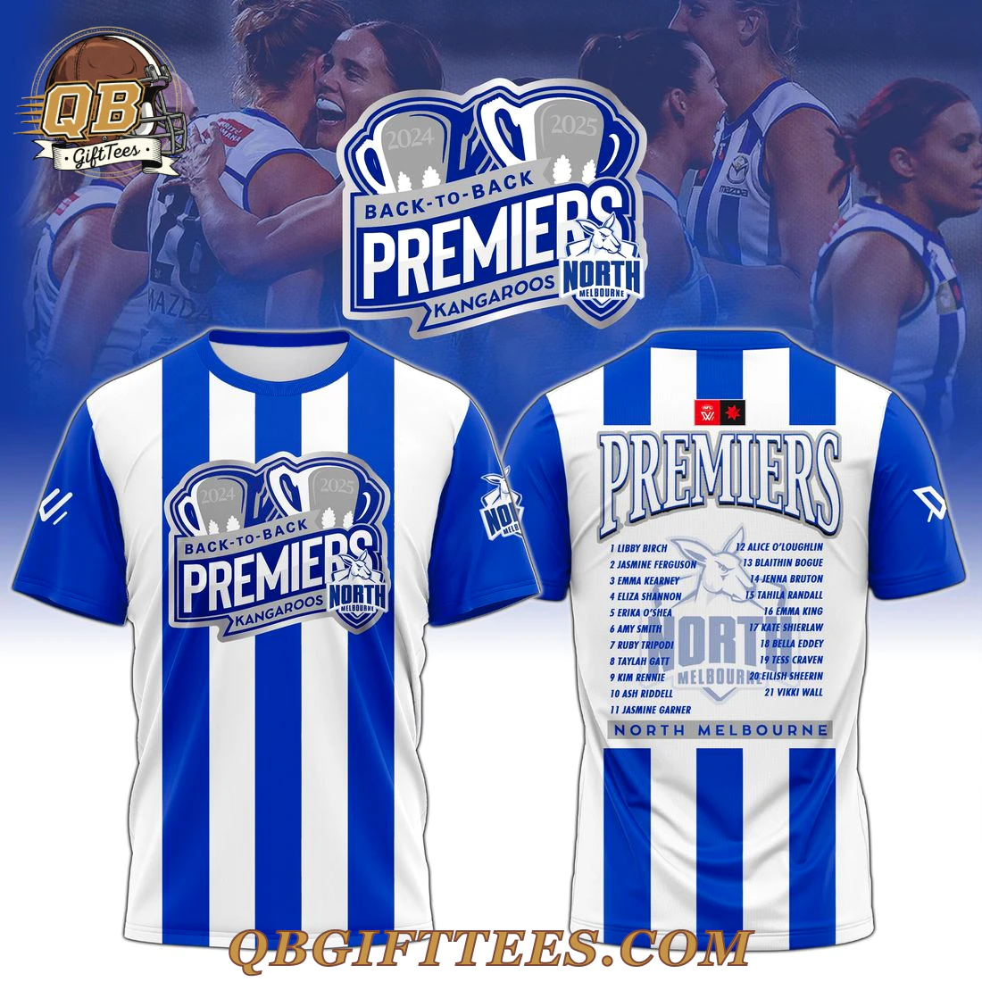 Celebrate the potential historic achievement with the Kangaroos 2025 AFLW Premiers Special Edition Hoodie. This exclusive garment connects directly with the unwavering spirit of North Melbourne Kangaroos fans, from long-time supporters to new enthusiasts, uniting all in the anticipation of a back-to-back premiership. The hoodie features the iconic blue and white vertical stripes on both the front and back. Prominently displayed on the chest is the central “2024 Back-to-Back 2025 Premiers” emblem, showcasing two silver premiership cups, flanked by “Kangaroos” and the North Melbourne shield logo. The left sleeve features a subtle Kangaroos “K” logo. Crafted from a soft, durable 280gsm polyester fleece blend, this hoodie offers excellent warmth and comfort, ideal for cooler conditions. It is designed with a relaxed fit, common for casual fan apparel, ensuring ease of movement.
